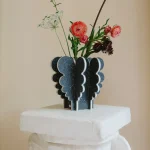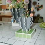 I was inspired by nearby Columbia Road Flower Market, and used recycled textile fiber board to make large blooming curves on vases, stools, shelves and candle holders. The white core of the material makes a striking contour.