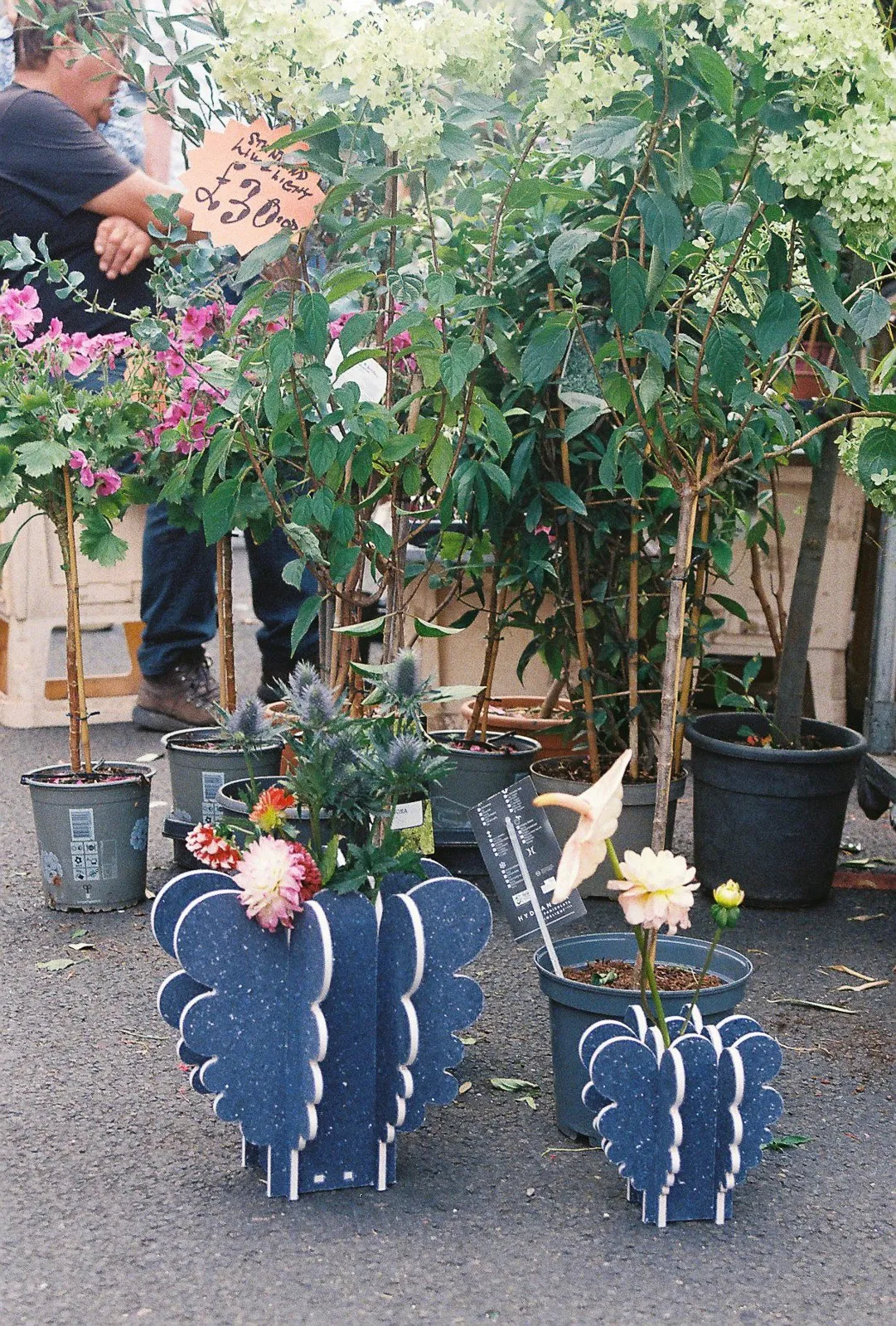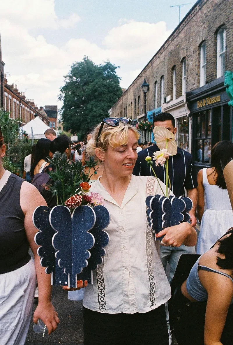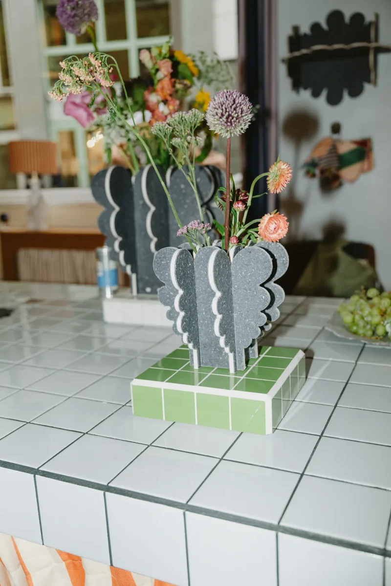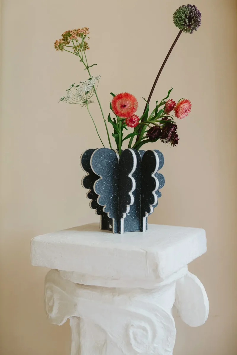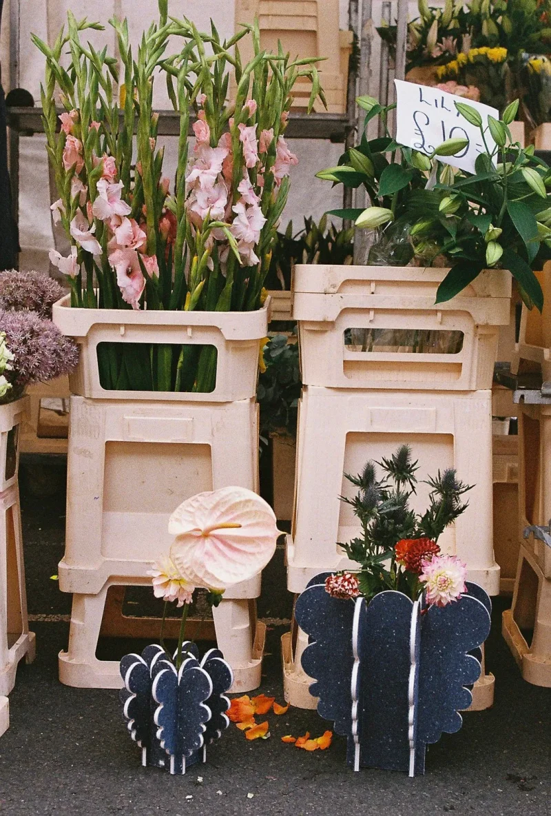 I was inspired by nearby Columbia Road Flower Market, and used recycled textile fiber board to make large blooming curves on vases, stools, shelves and candle holders. The white core of the material makes a striking contour.