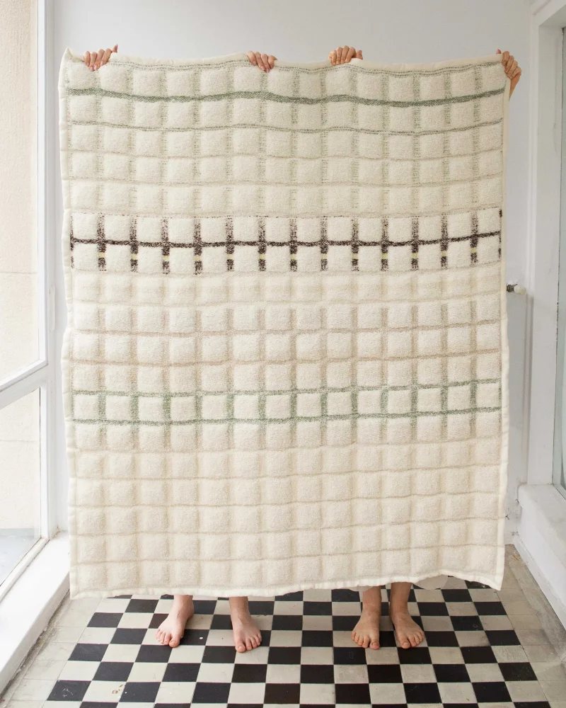 Crafted with meticulous attention to detail, these blankets are double-faced, offering a versatile and luxurious feel. Woven on a traditional harness loom, they are also skillfully stuffed with merino nepps, enhancing their texture and warmth.