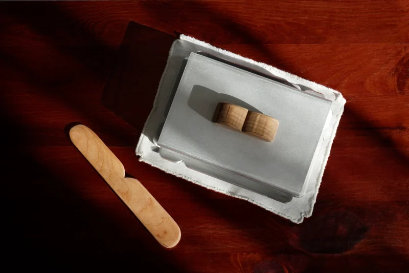 The butter dish and its accompanying knife are sculptural responses to the folds and edges of ornamental napkins, reimagined in aluminum and hand-carved cherry wood.