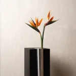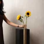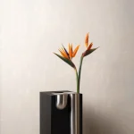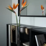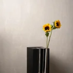 The Bookcase Vase is an L-shaped stainless steel piece designed to rest effortlessly on the edge of any 90-degree cornered shelf or surface. Requiring no screws or permanent fixing, it uses gravity and geometry to hold its place with quiet assurance. The form allows flowers to appear almost tucked into the architecture of the shelf – turning an ordinary corner into a small moment of display.