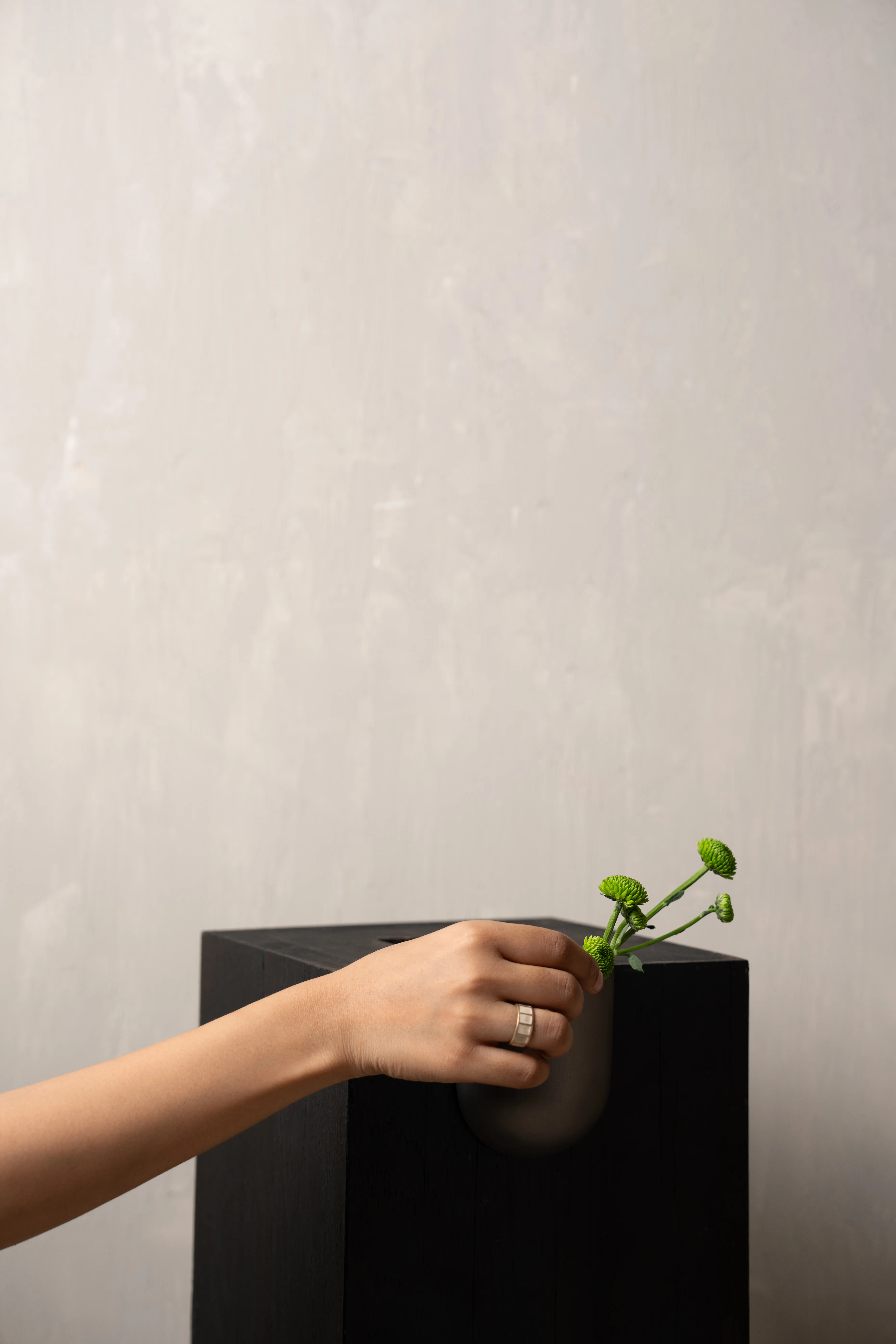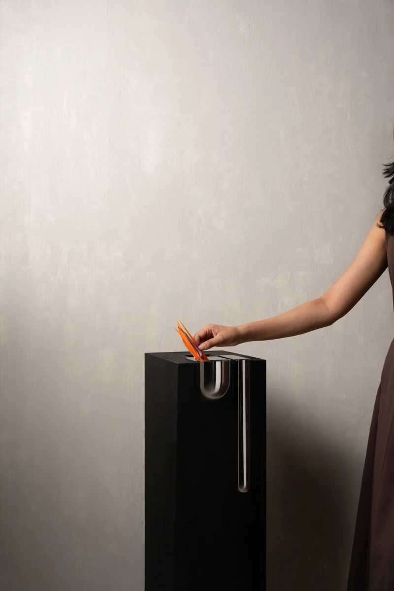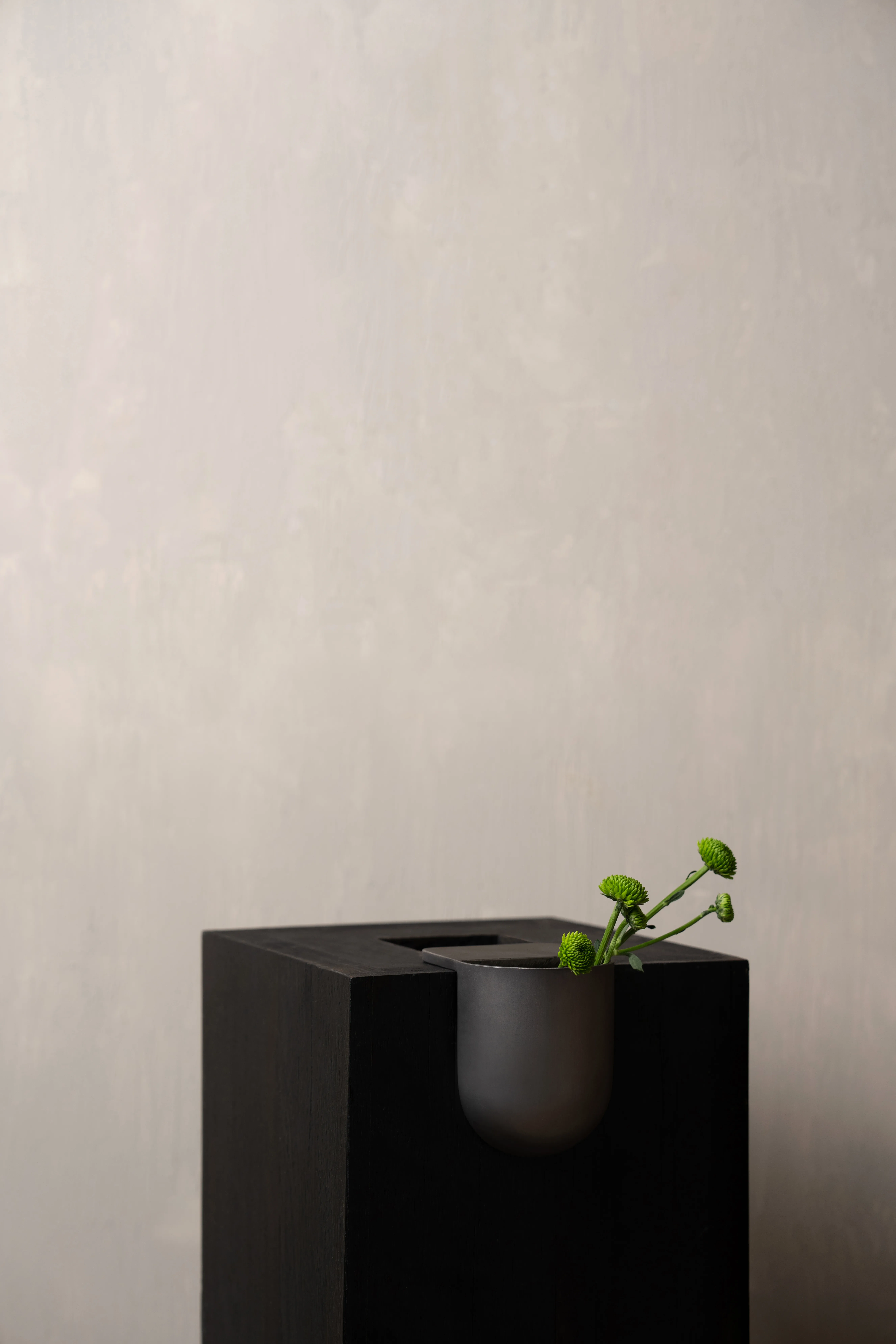 The Bookcase Vase is an L-shaped stainless steel piece designed to rest effortlessly on the edge of any 90-degree cornered shelf or surface. Requiring no screws or permanent fixing, it uses gravity and geometry to hold its place with quiet assurance. The form allows flowers to appear almost tucked into the architecture of the shelf – turning an ordinary corner into a small moment of display.