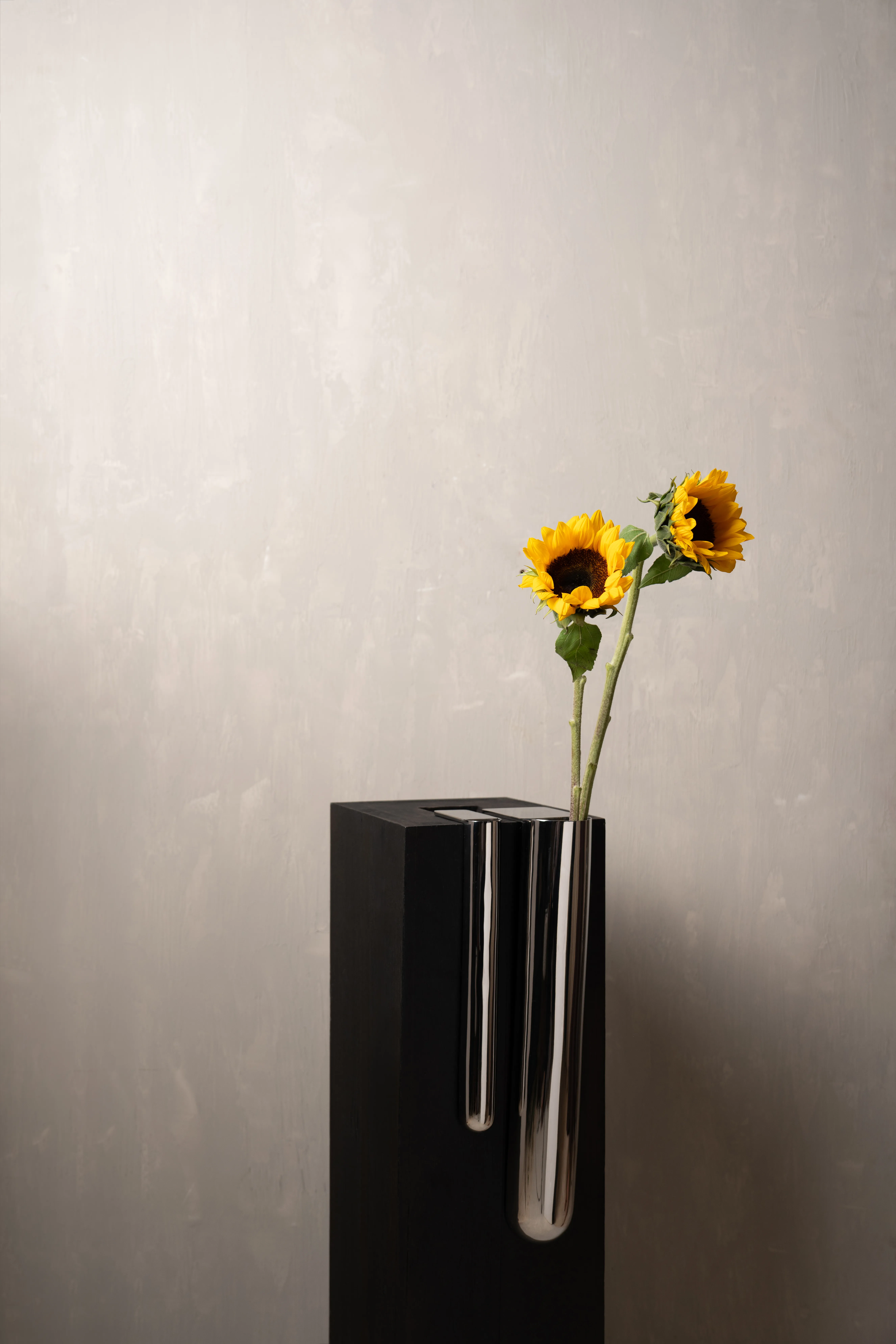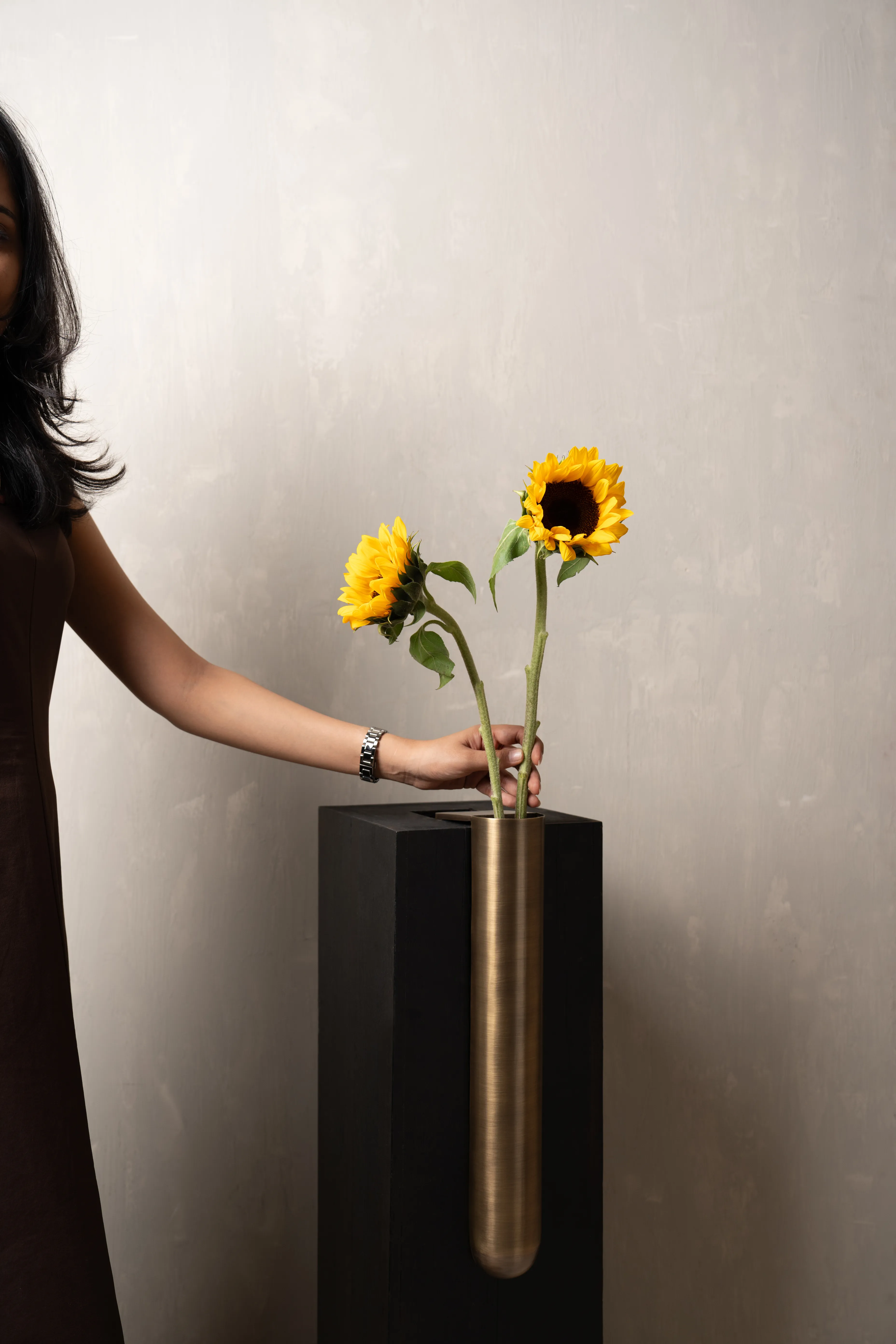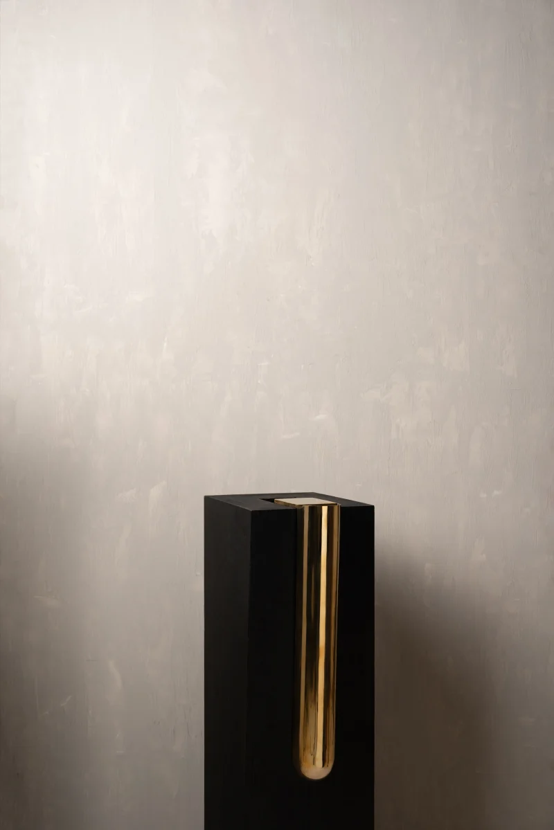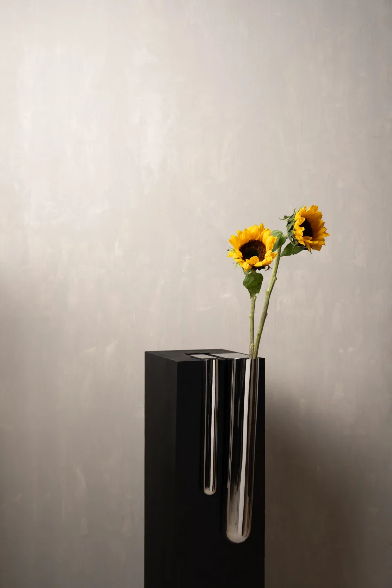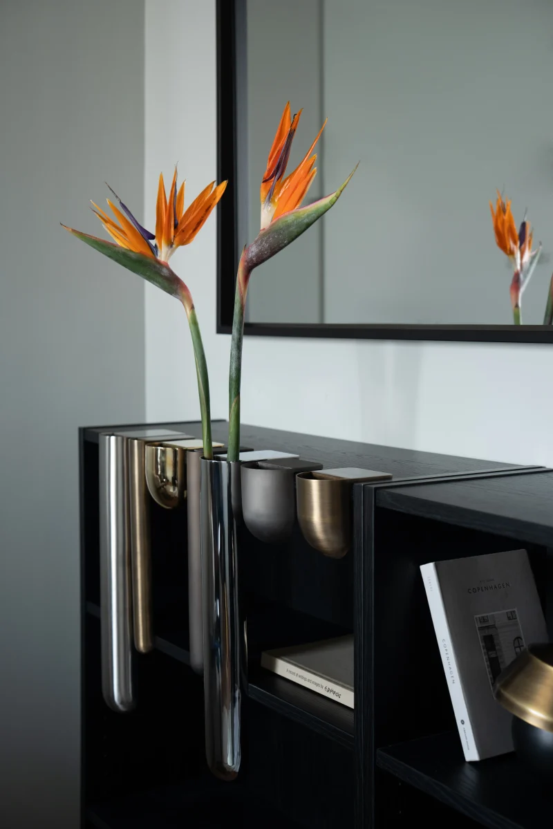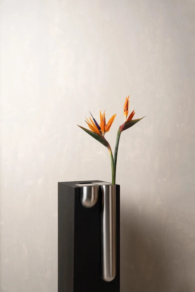 The Bookcase Vase is an L-shaped stainless steel piece designed to rest effortlessly on the edge of any 90-degree cornered shelf or surface. Requiring no screws or permanent fixing, it uses gravity and geometry to hold its place with quiet assurance. The form allows flowers to appear almost tucked into the architecture of the shelf – turning an ordinary corner into a small moment of display.