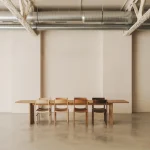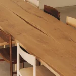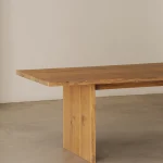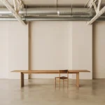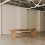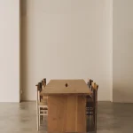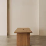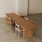 This table by Mike Hausmann is crafted from two bookmatched slabs, revealing part of the bark along the joint where the two pieces meet, creating a centered opening in the tabletop. The design aims to give full prominence to the tree itself, which is why it has been kept deliberately simple.