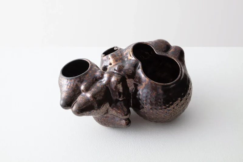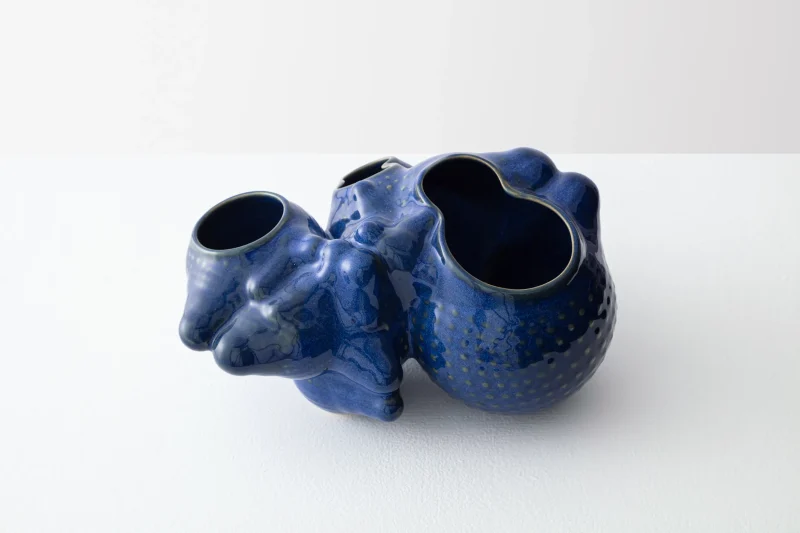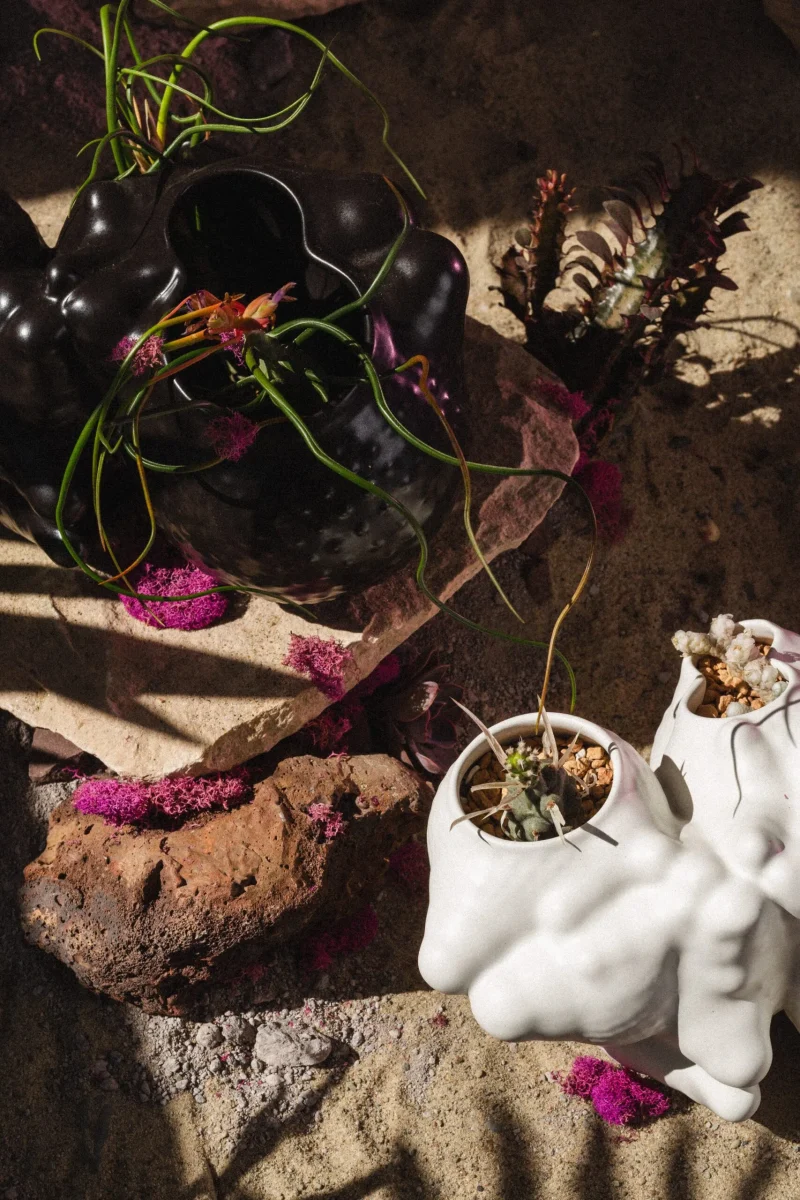 The “Botryoidal Planter” by Forma Rosa Studio is a symbiotic planter inspired by cacti and for cacti, that welcomes multiple plants in a pot. This piece is named after a natural mineral texture composed of many rounded segments. The formations of its shell have been digitally grown through coding and then materialized in an experimental process of handcrafted ceramic and glaze work. Featuring custom glazes that perform in unique ways during their firing process, the bubbly-like form is accentuated as folds capture deeper crystal hues or textures, and convexities show smoother moments of color.