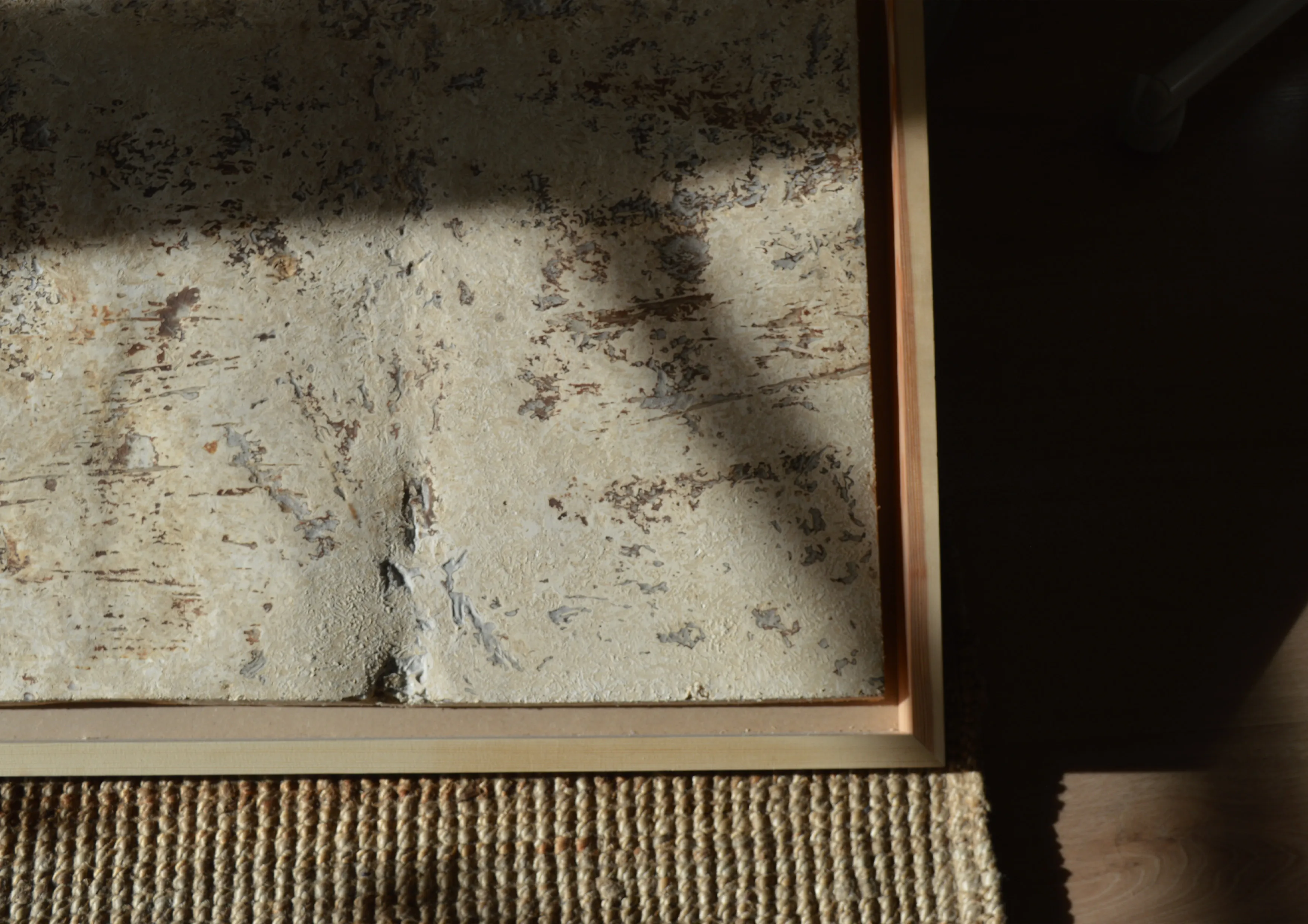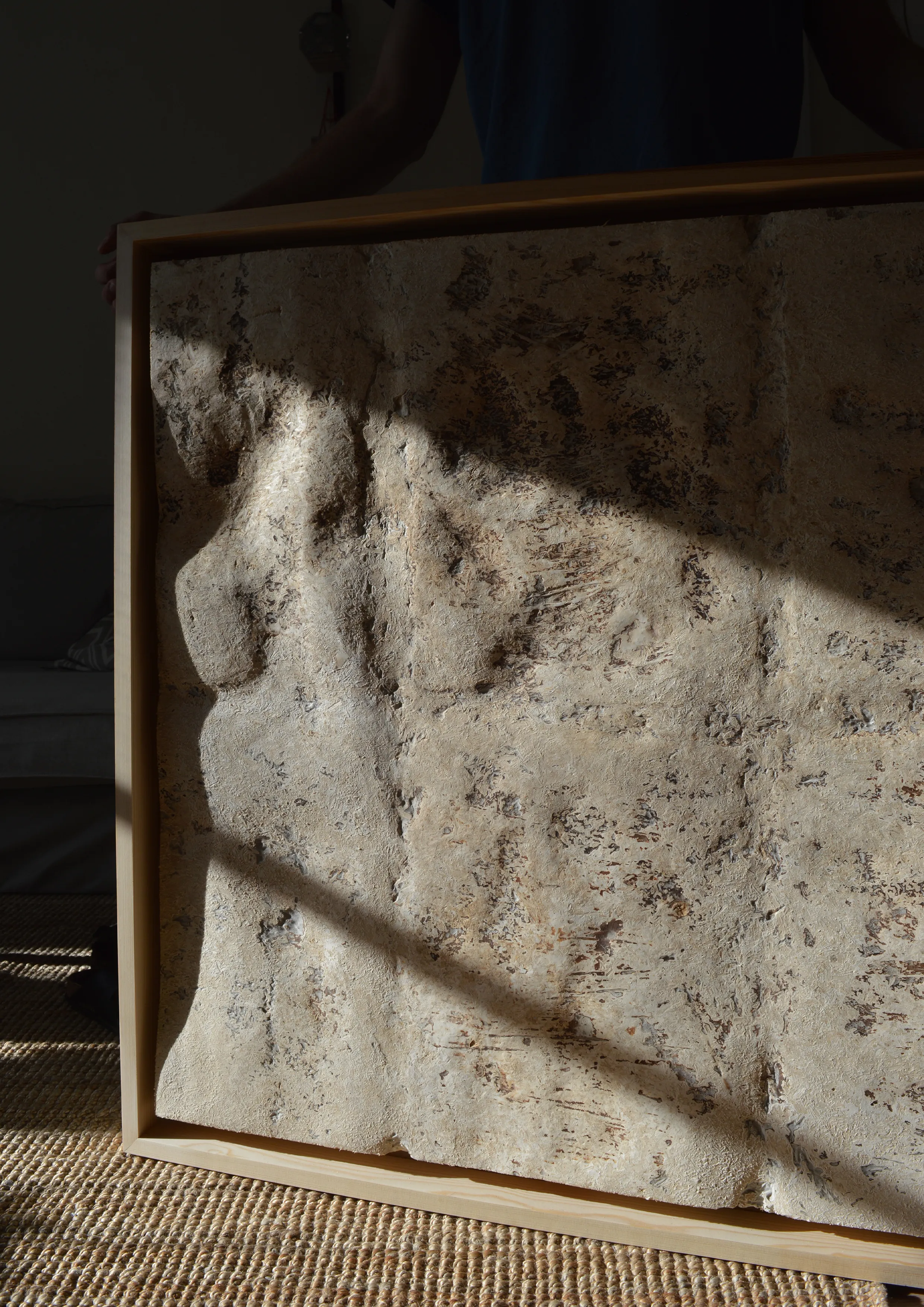 artistic collectible painting artistic wall decor avant-garde artwork collectible art object conceptual painting contemporary fungal art contemporary mixed media experimental art piece experimental painting floating frame art fungal inspired art mixed media painting modern experimental art modern wall art mycelium painting mycelium wall panel organic texture painting patched and sanded artwork tactile wall art textured surface art unique art piece Wabi Sabi