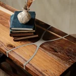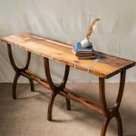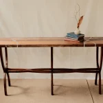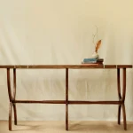 Bathed in ambient light, the teakwood console showcases elegance and craftsmanship. Its sleek design is enhanced by a delicate aluminium inlay on the shaded grainy teakwood top, adding texture and visual appeal. Supported by ribbon-like teakwood legs, it exudes modern sophistication with a touch of charm.