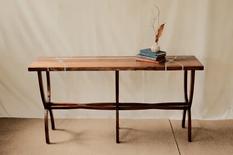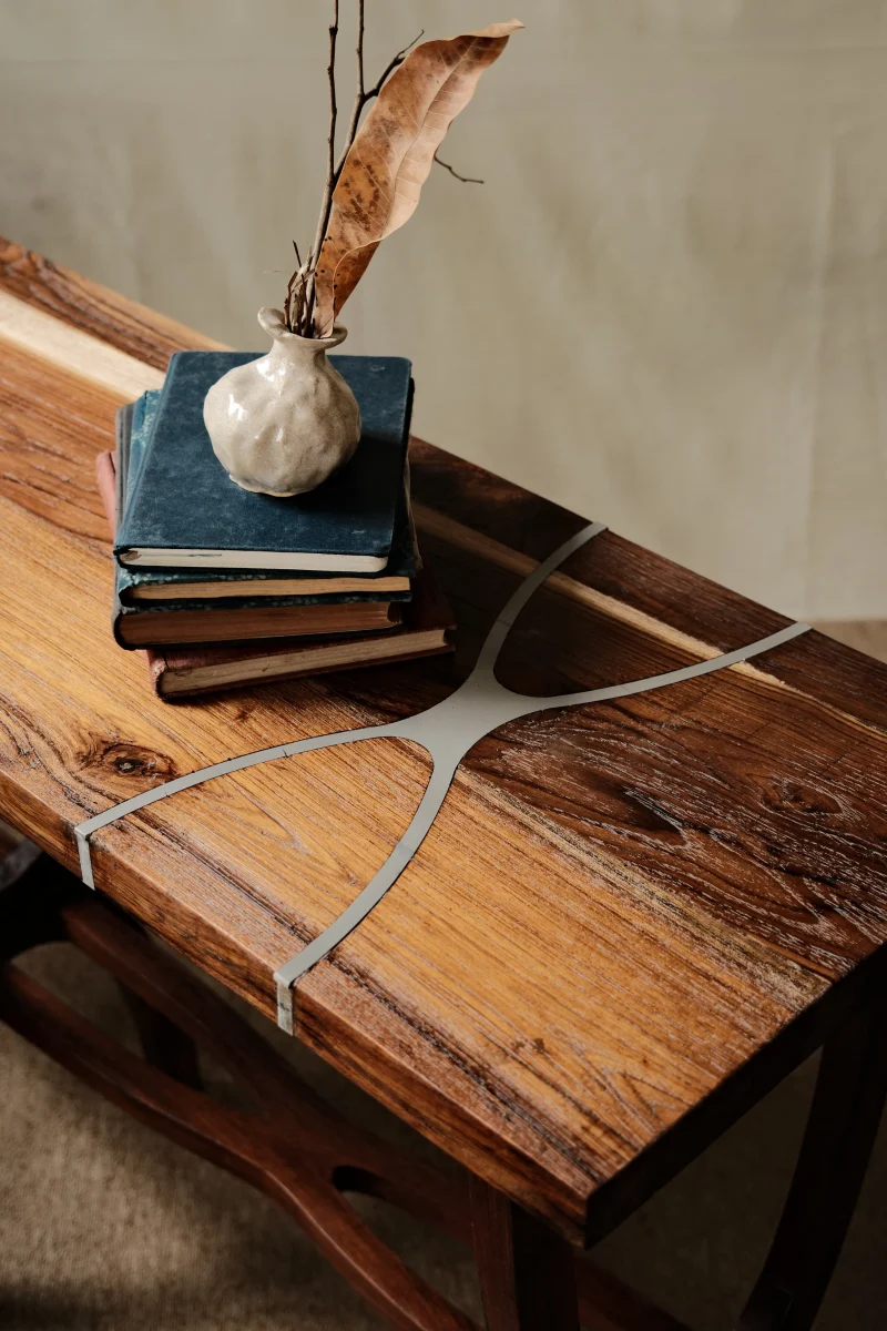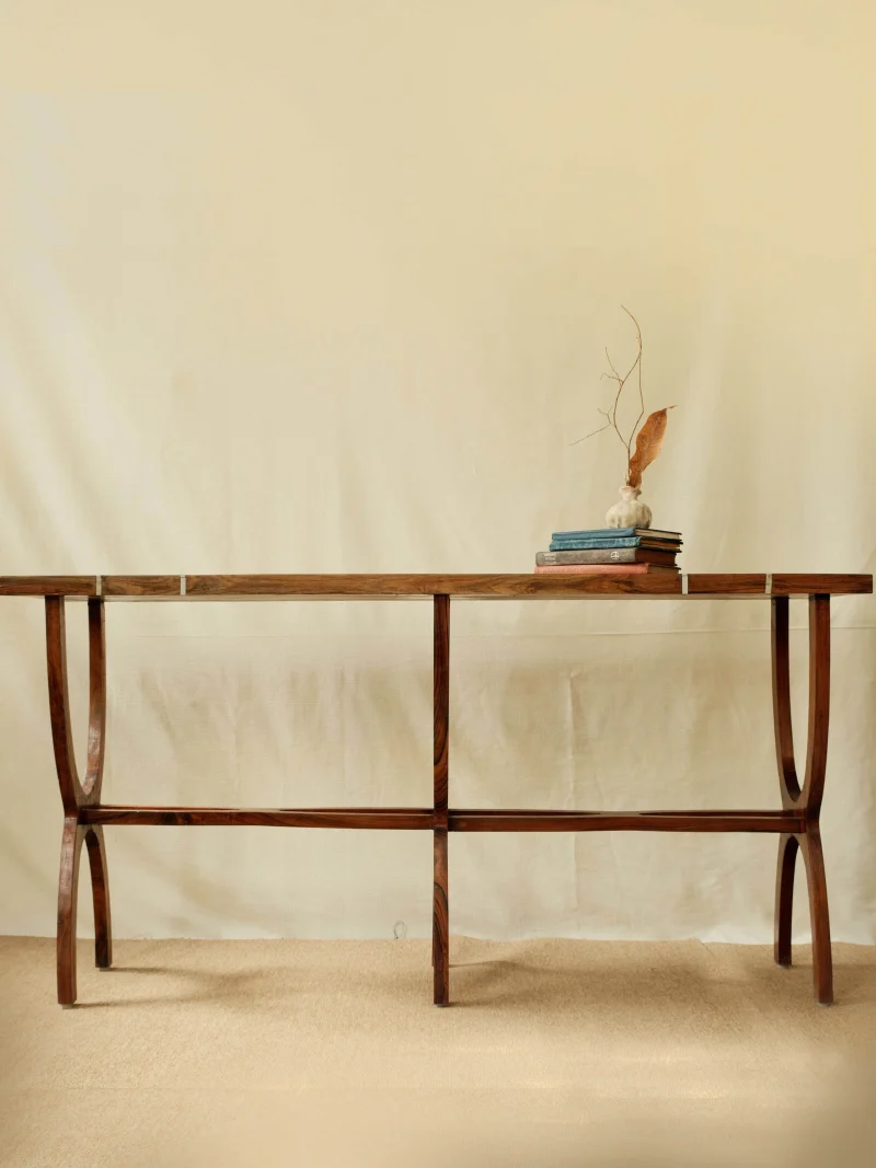 Bathed in ambient light, the teakwood console showcases elegance and craftsmanship. Its sleek design is enhanced by a delicate aluminium inlay on the shaded grainy teakwood top, adding texture and visual appeal. Supported by ribbon-like teakwood legs, it exudes modern sophistication with a touch of charm.