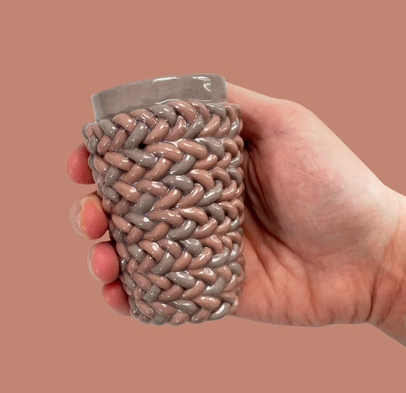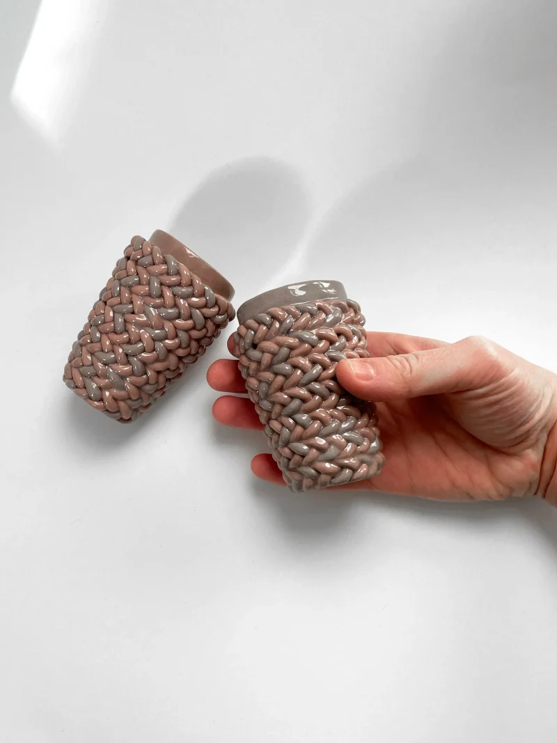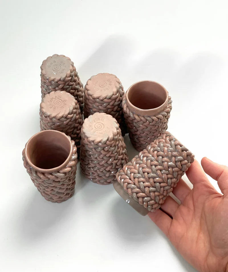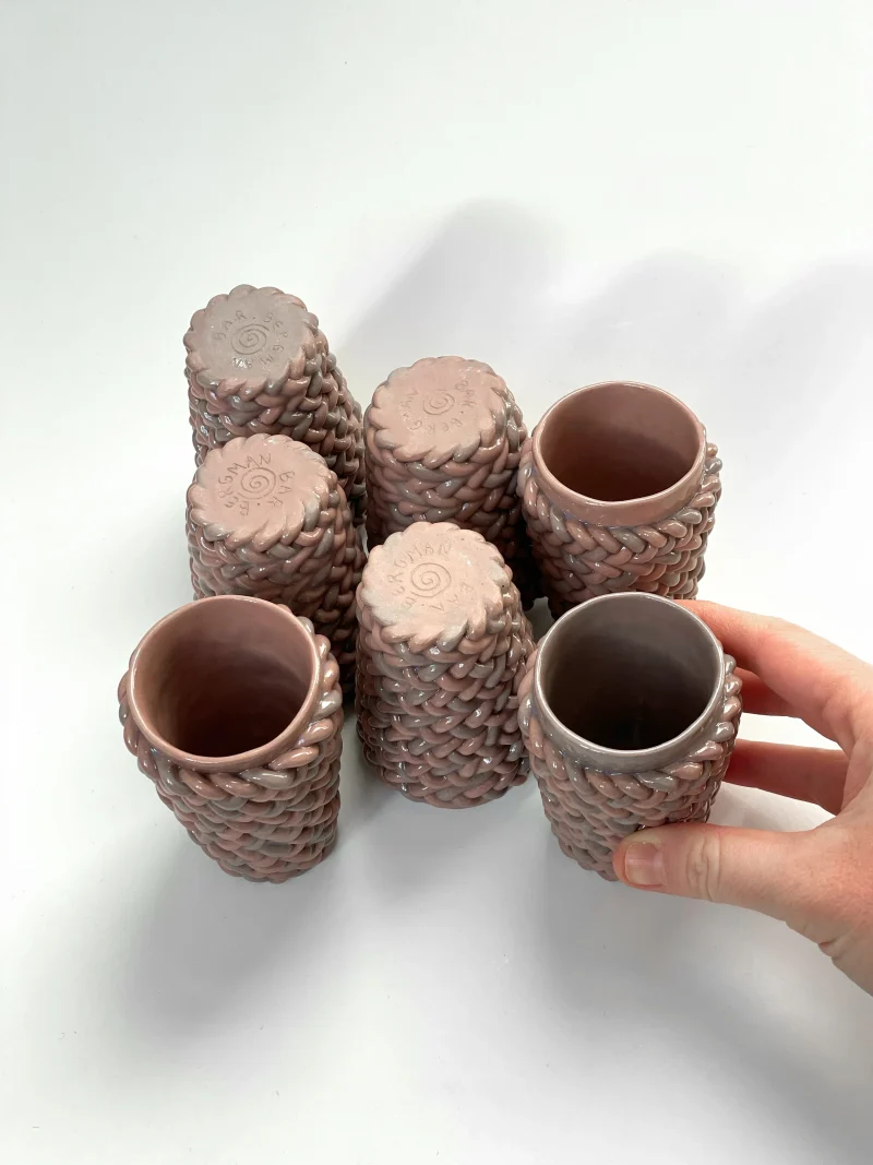 Espresso cup, by Bar Bergman made out of braided clay, coloured with purple and pink pigments. Shiny glaze finish, suitable for the dishwasher.