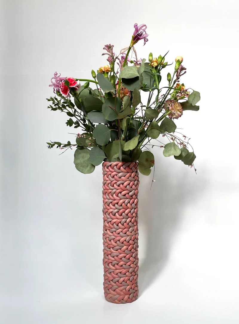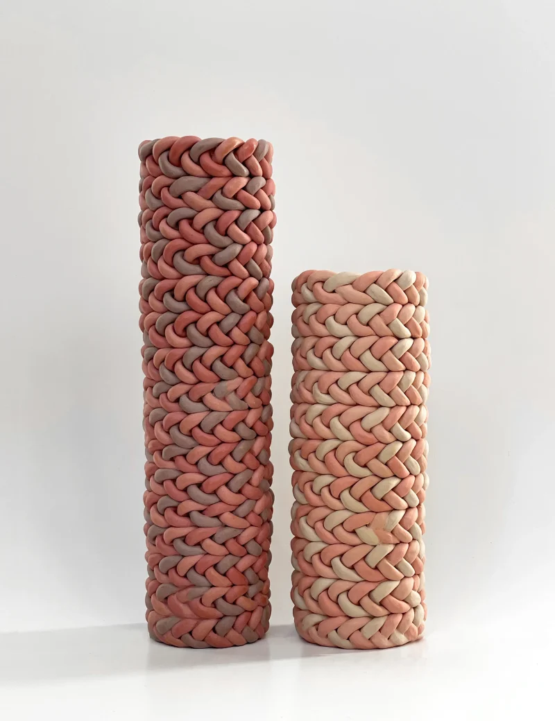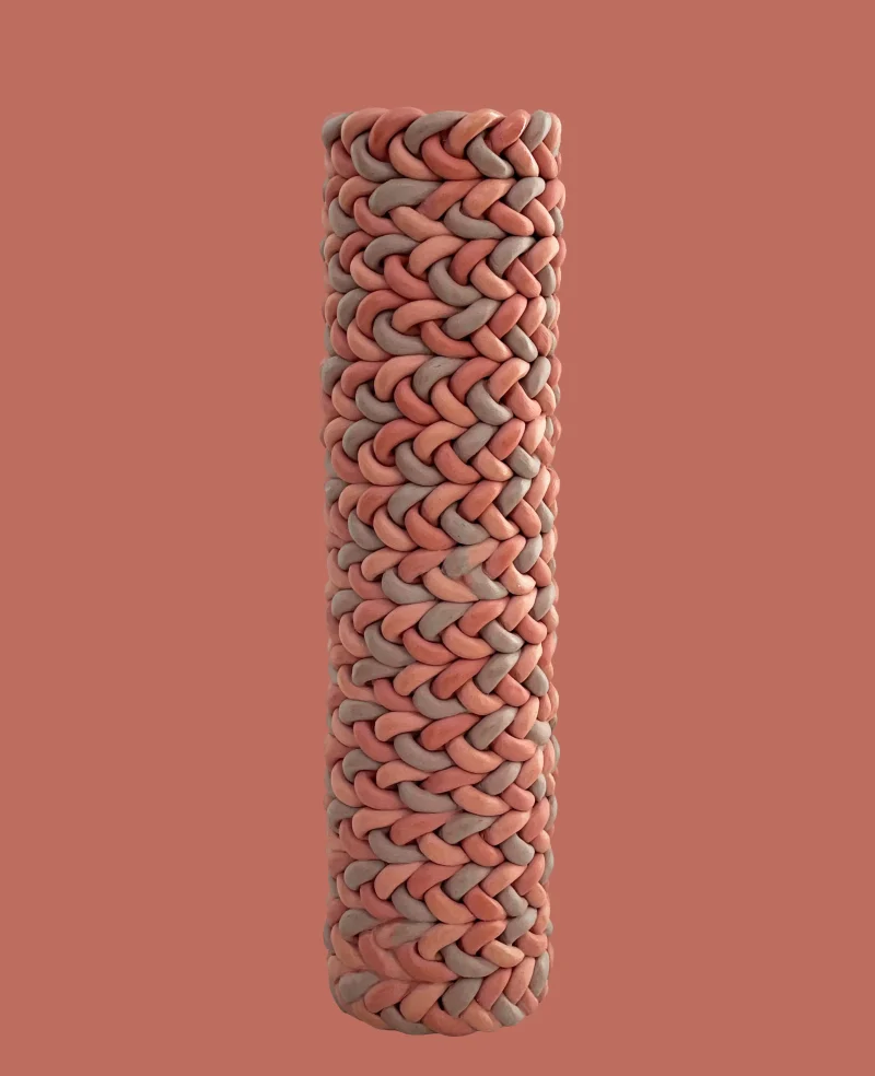 Ceramic braided vase, made from coloured clay (white clay coloured with pigments), matte finish, glazed inside.