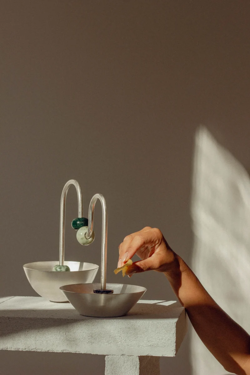 The brass Aperitivo Set is a charming plated brass centerpiece that combines playfulness and conviviality. Crafted in Italy by Natalia Criado design studio, the Aperitivo Set features two geometric bowls connected by a curved metal piece and three sliding quartz stones, a playful nod to Art Deco design. Made with care and using various techniques from metal sheet turning to manual bending, this set embodies Italian craftsmanship, adding sophistication to your cocktail hour. Experience the perfect blend of aesthetics and functionality with our expertly crafted Aperitivo Set.