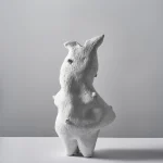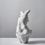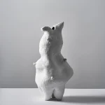 This sculptural vessel by Not Yet Ceramics possesses a soft, organic form, subtly echoing the delicate contours of a hare in repose. Its matte white surface, punctuated by glossy highlights, accentuates its fluid lines and quiet dynamism, evoking a sense of gentle movement frozen in time.