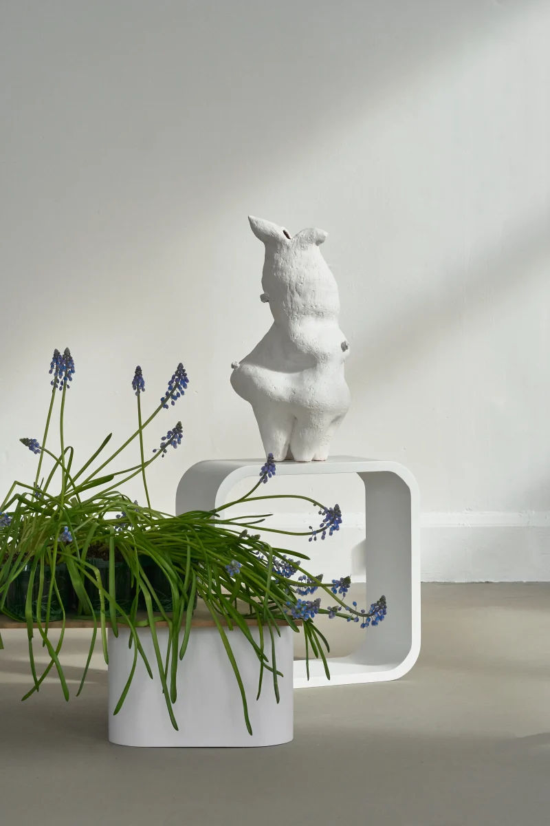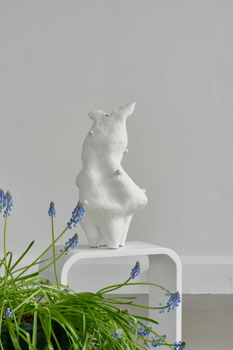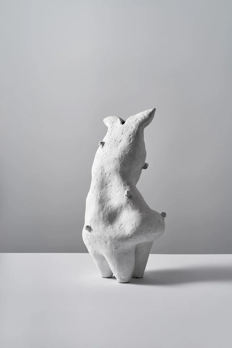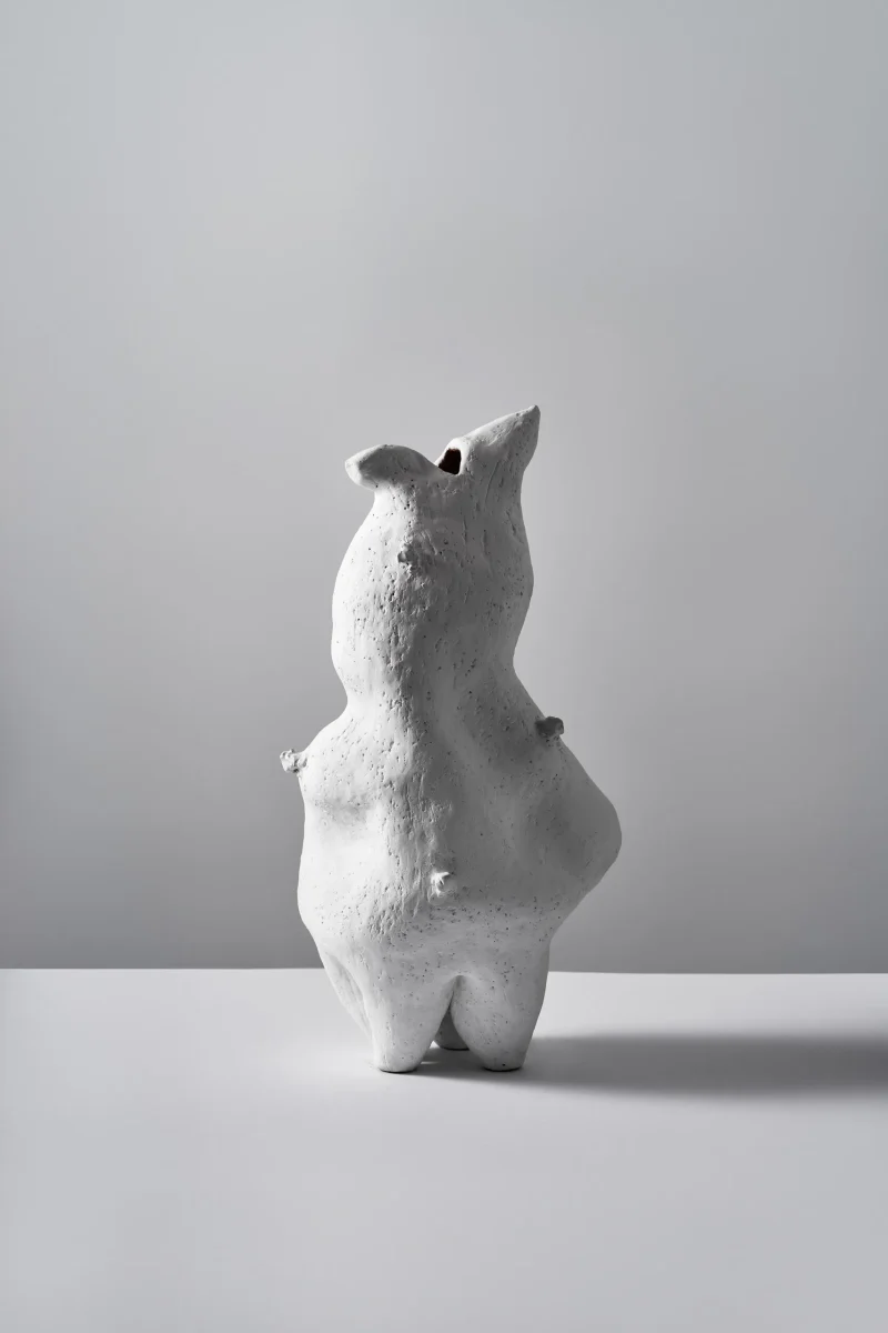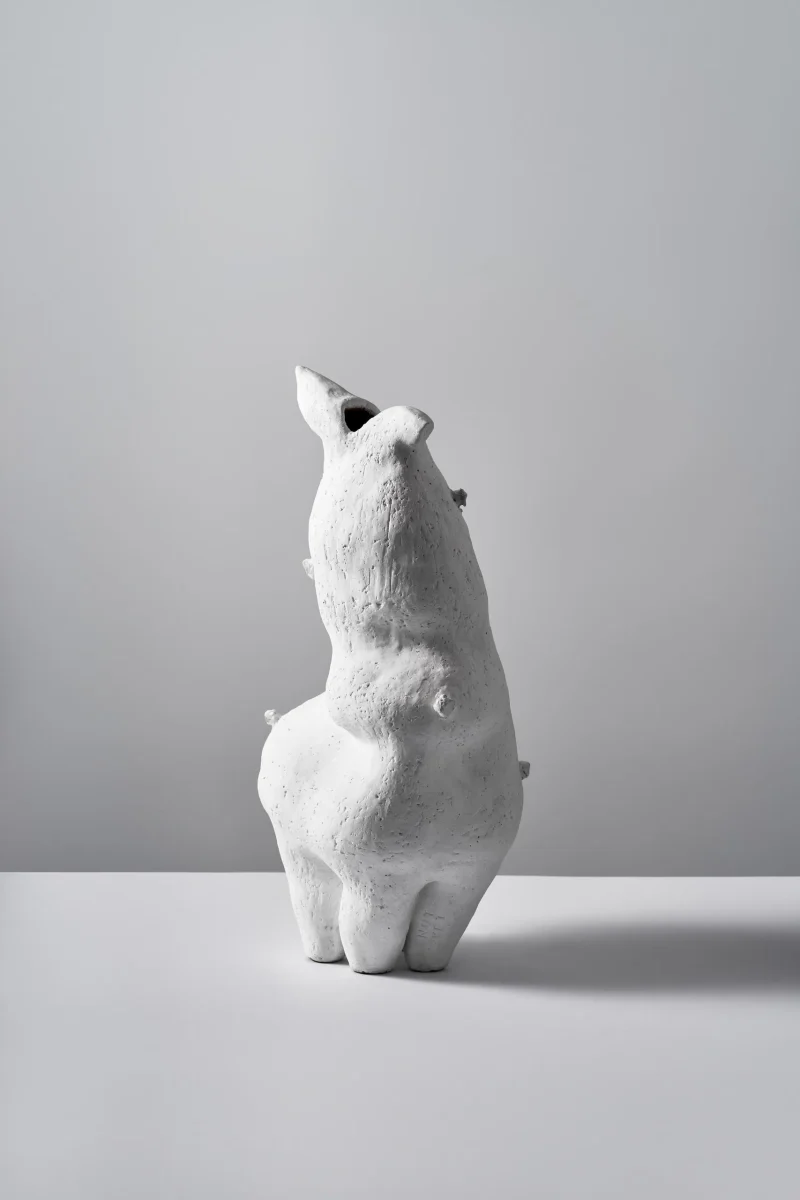 This sculptural vessel by Not Yet Ceramics possesses a soft, organic form, subtly echoing the delicate contours of a hare in repose. Its matte white surface, punctuated by glossy highlights, accentuates its fluid lines and quiet dynamism, evoking a sense of gentle movement frozen in time.