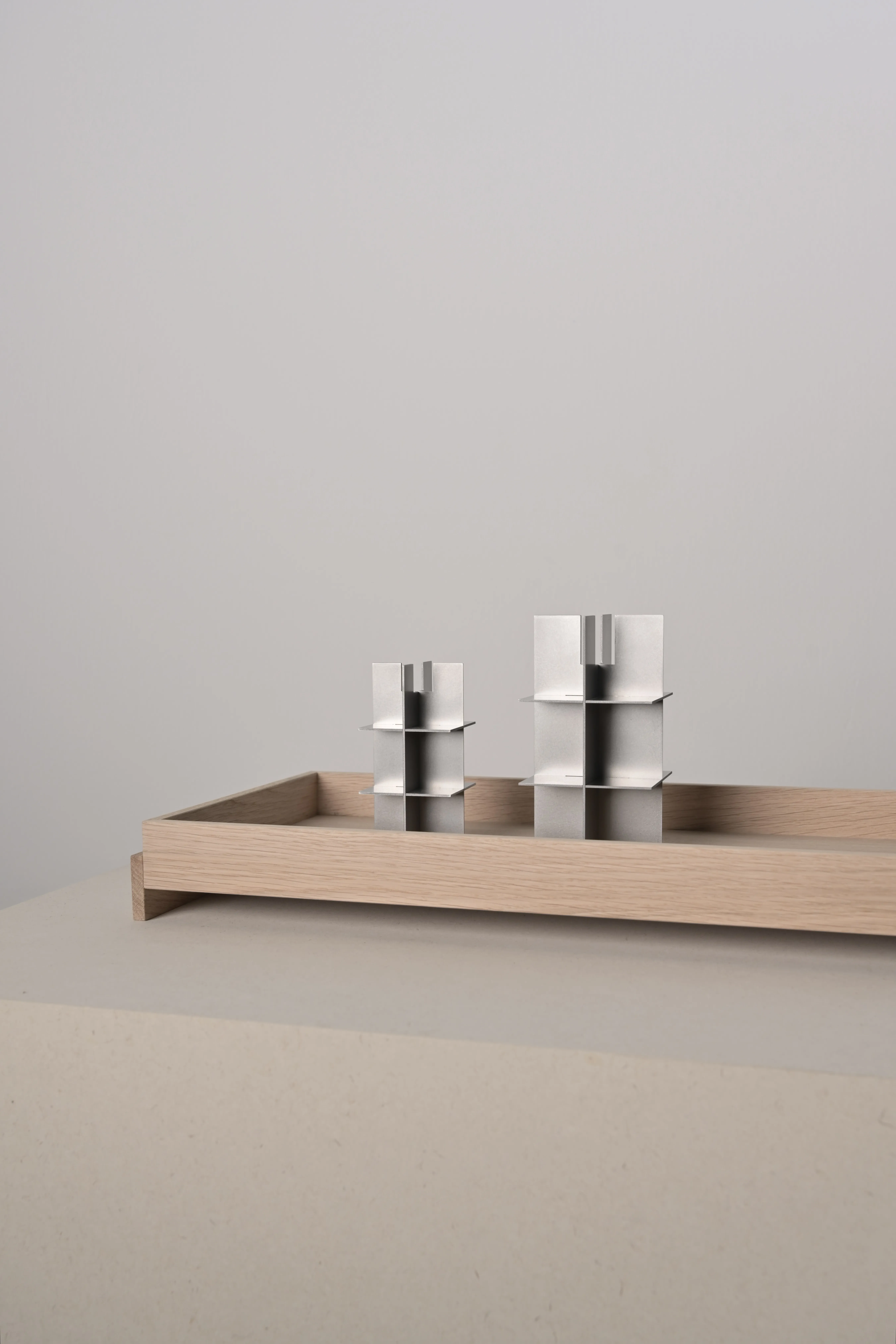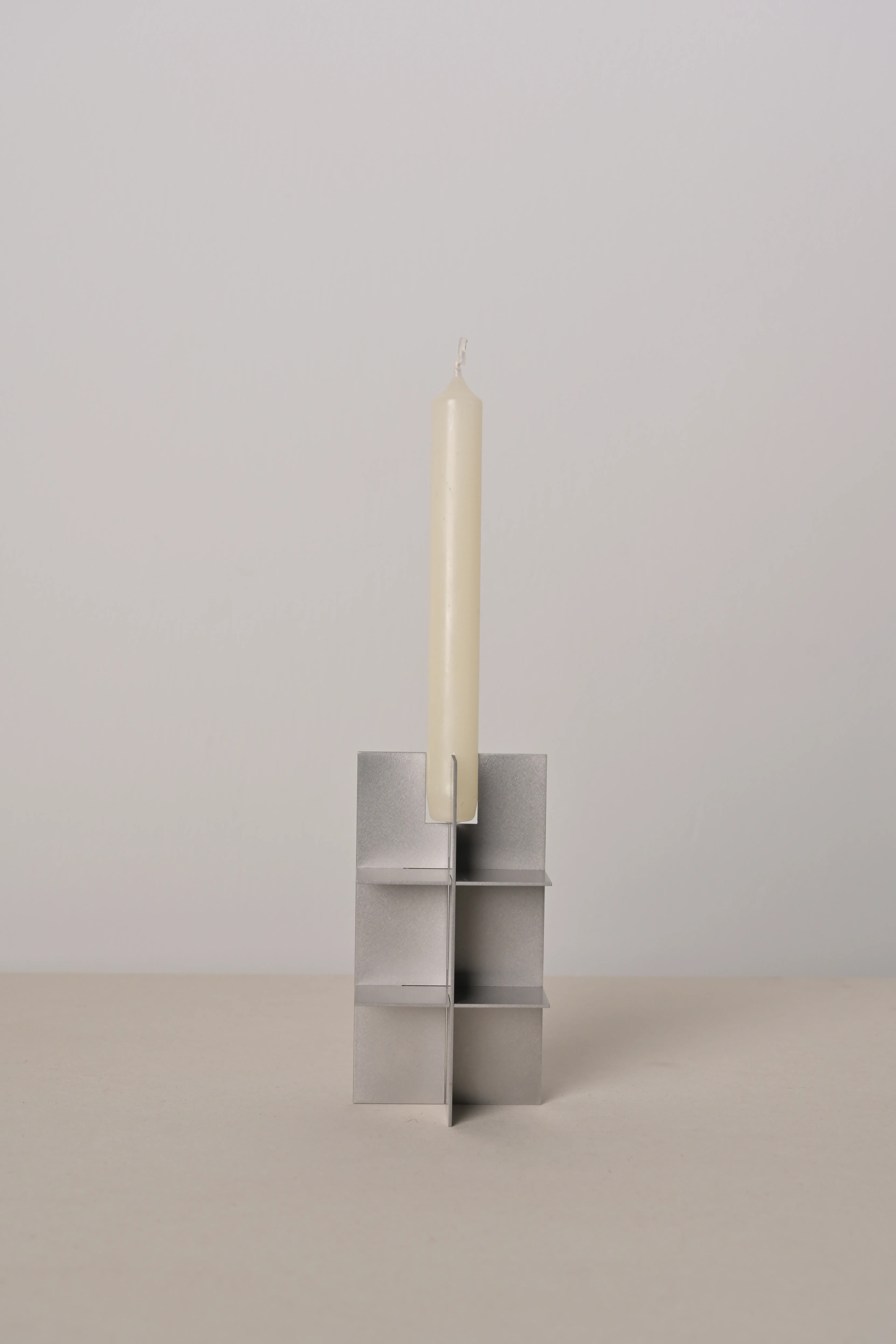 The FRAME candleholder articulates a Brutalist sensibility through radical geometric reduction. Steel plates interlock to form a structure defined as much by its voids as by its mass. The precisely calibrated intervals are active spatial agents, introducing rhythm, permeability, and shifting light into the severe order of the form. At its center, the candle becomes a temporal counterpoint: a flickering presence within the permanence of steel. The work situates itself between object and architecture, examining how construction, material, and atmosphere converge into an austere yet poetic expression.