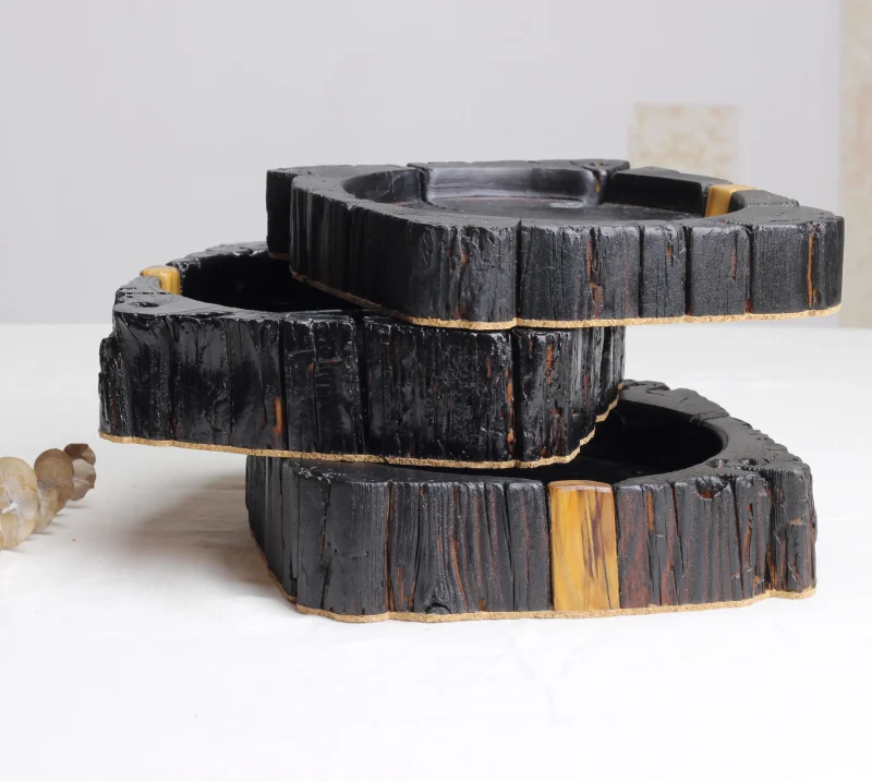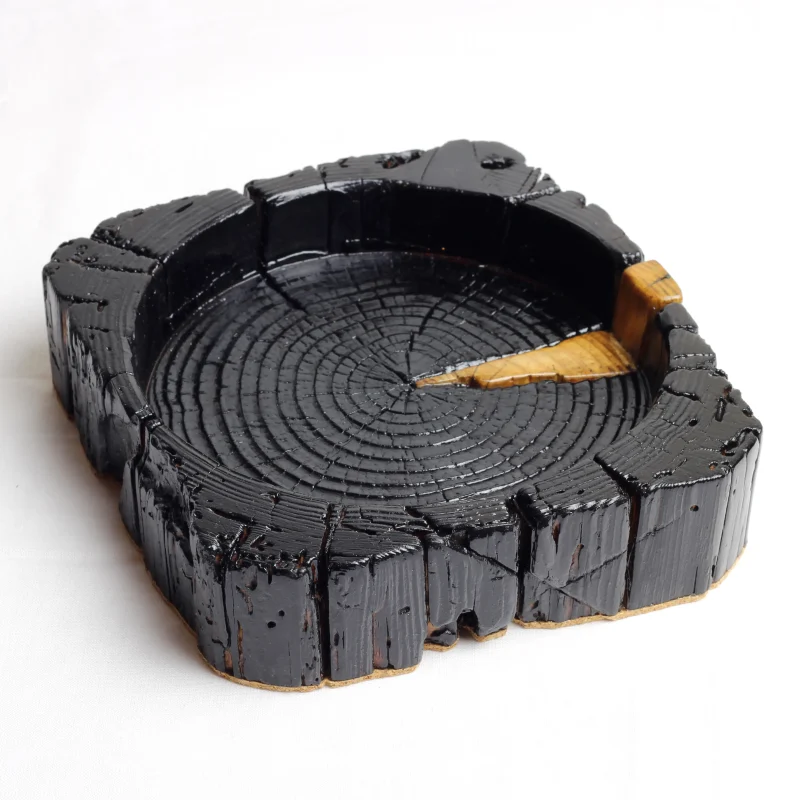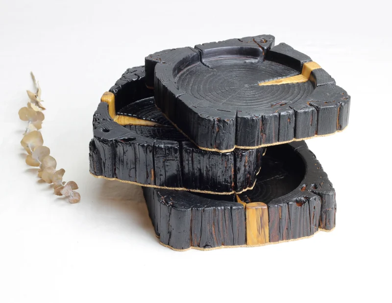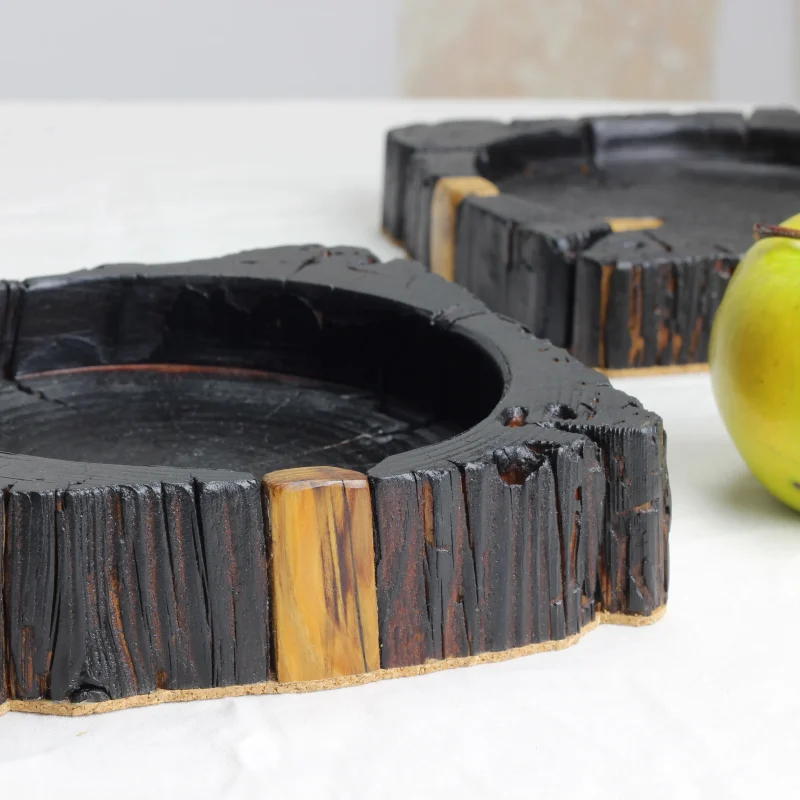 Elegantly crafted, these wooden trays—ideal for jewelry or as desk organizers—are fashioned from timeworn barn beam wood. They undergo the traditional Japanese Yakisugi burning technique and are meticulously treated with natural oils, then safeguarded with a layer of beeswax. A discreet cork lining graces their base, ensuring your furniture remains unscathed. Any pronounced fissures are seamlessly mended using unburned wood fragments from the same venerable beam.