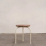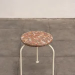 The collection also includes lighter pieces, such as side tables in two heights and a three-legged stool, whose supports are made from old metal rods taken from the railings that used to protect the windows in our workshop. The pieces are available in raw grey, representing the natural coloring of demolition waste, without additives, or in a brown pigmented version. The metal bases can be found in sand, terracotta or brown, offering various combinations.