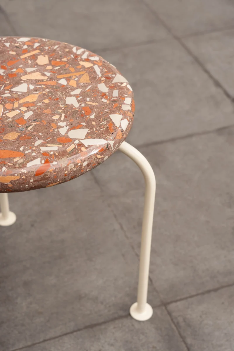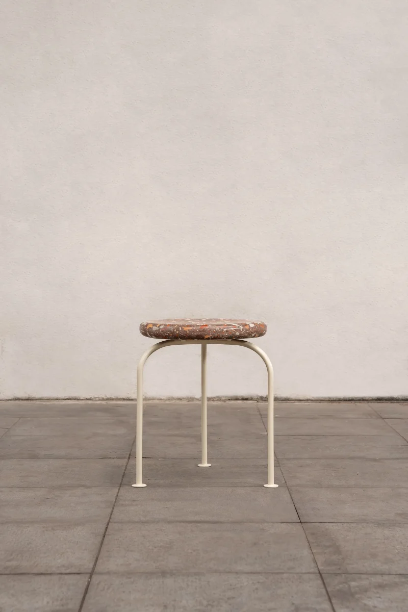 The project seeks to experiment with new ways of reusing solid waste that would otherwise be discarded, giving this raw material a leading role in new constructions. The waste used includes leftover ceramics, porcelain, tiles and mortar, all crushed into appropriate sizes. The simple, uncomplicated shapes of the pieces allow the dynamic pattern of demolition materials to show through in an authentic way. This design is honest with its materiality and reveals its natural composition with grace, evoking the brutalist movement by highlighting the use of exposed raw materials and the display of structural elements rather than adornment.