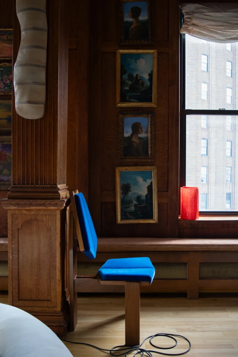 Crafted with a meticulous attention to detail, the chair’s warm wooden frame provides a harmonious contrast to its rich, deep blue velvet upholstery. The sumptuous fabric invites relaxation while enhancing the chair’s sculptural aesthetic, creating a unique balance between comfort and artistic expression.