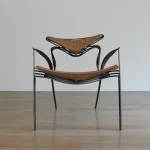 A study in contrast and form, the design merges Art Nouveau’s organic curves with a Brutalist exoskeleton frame, raw leather, and the quiet restraint of mid-century modern design.