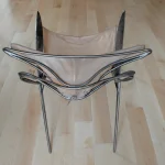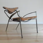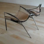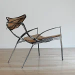 The chair’s splayed legs and whiplash silhouettelend a sense of movement, while the materiality of steel and leather root it firmly in the physical
