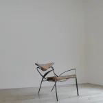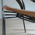 The steel frame, hand-shaped and finished with a forced patina, offers depth and variation. The vegetable-tanned leather will evolve naturally over time, shifting from soft, pink-tan tones to rich, warm browns — a living surface that records its environment.