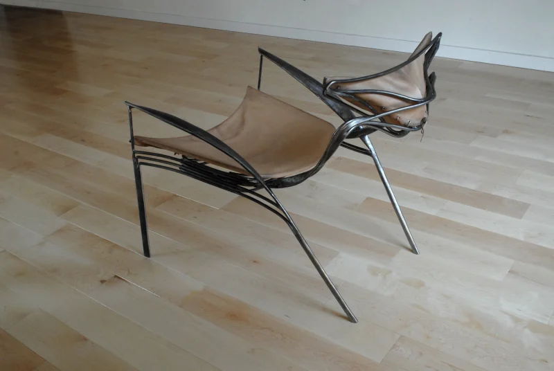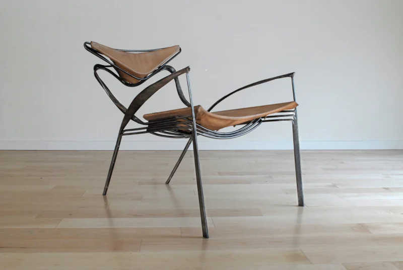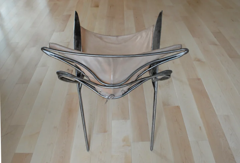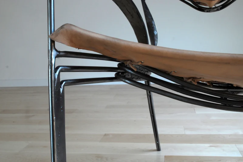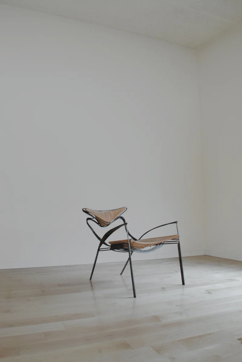 The steel frame, hand-shaped and finished with a forced patina, offers depth and variation. The vegetable-tanned leather will evolve naturally over time, shifting from soft, pink-tan tones to rich, warm browns — a living surface that records its environment.