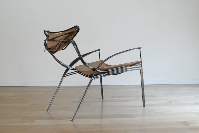 The chair’s splayed legs and whiplash silhouettelend a sense of movement, while the materiality of steel and leather root it firmly in the physical