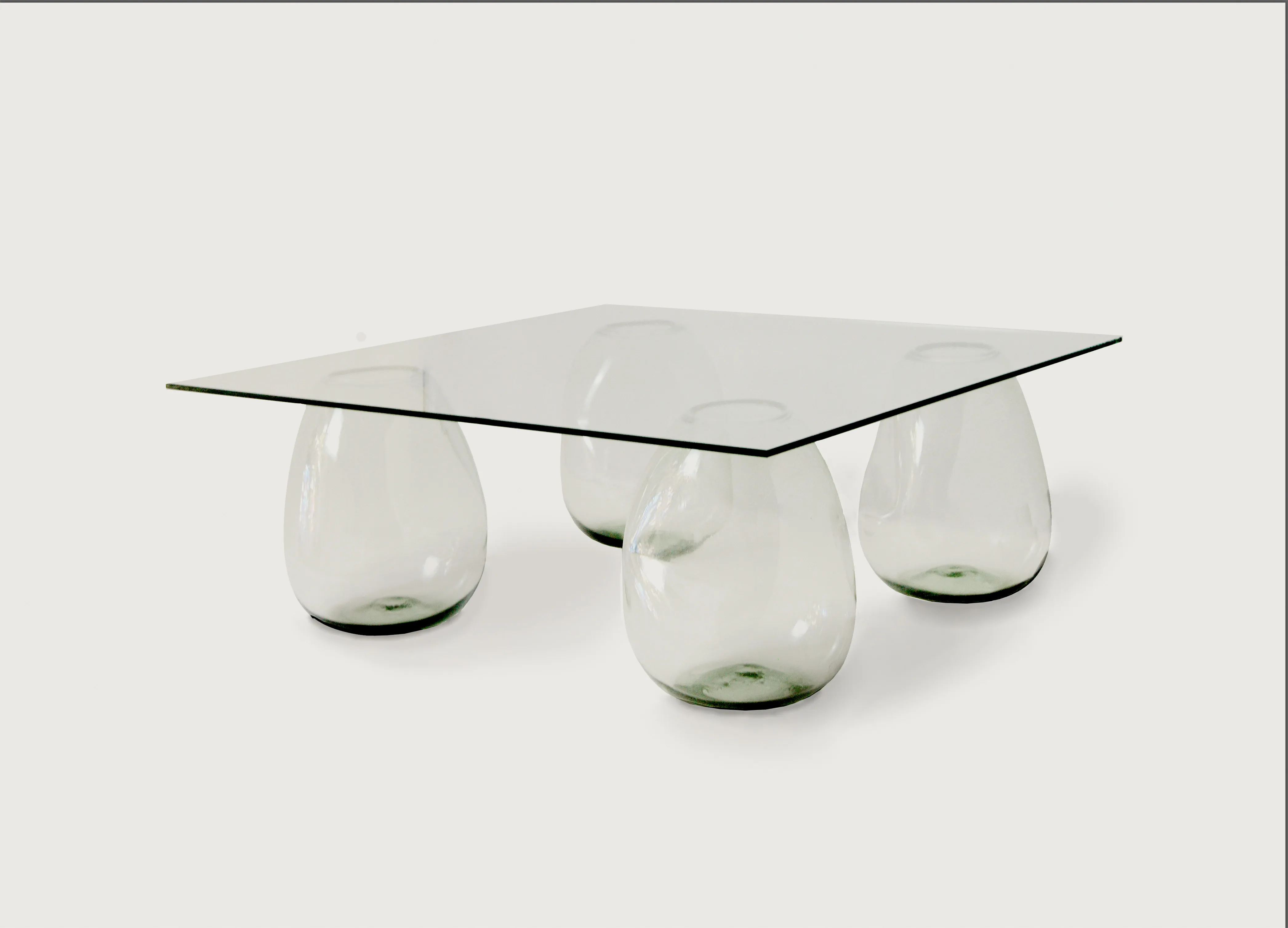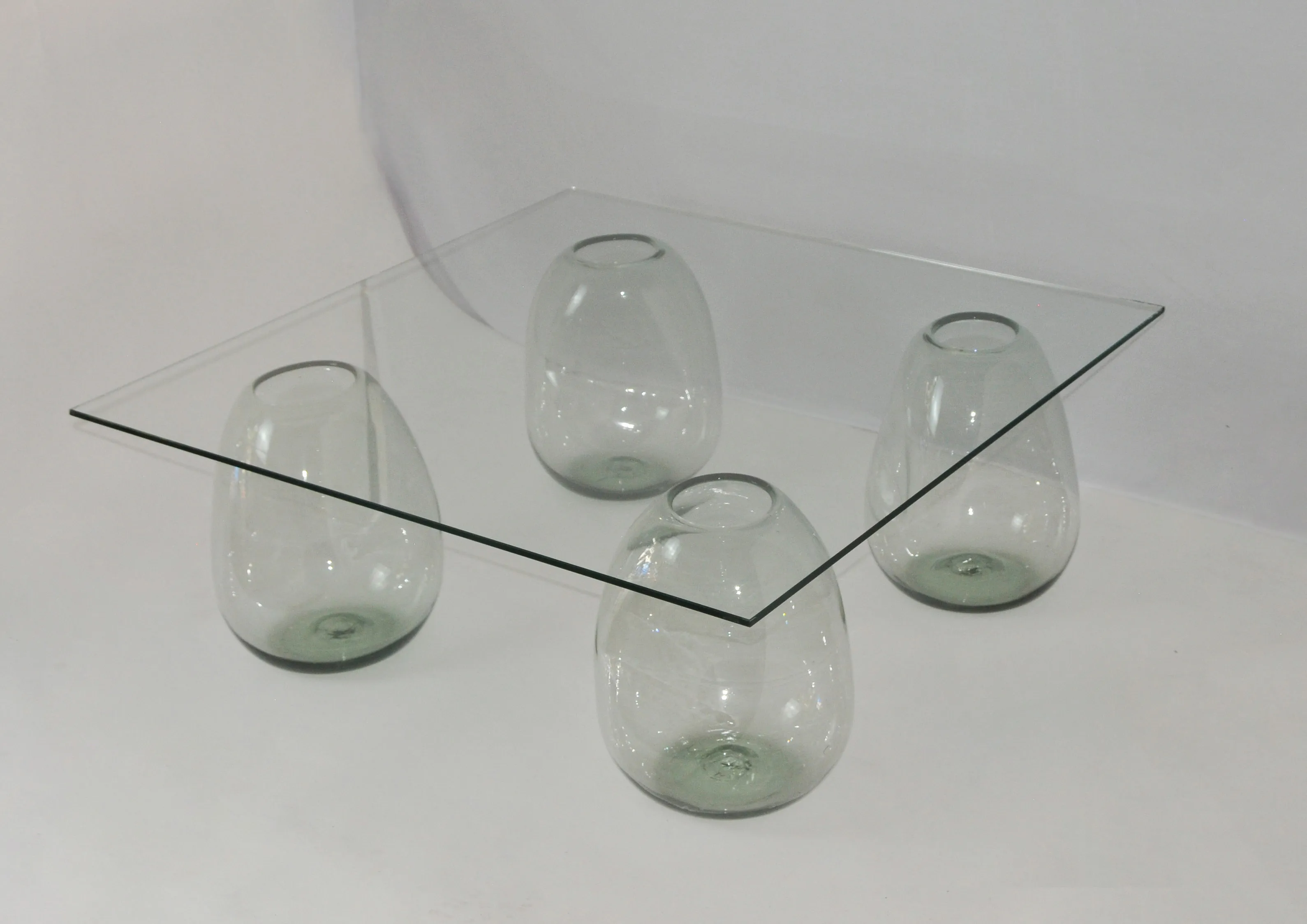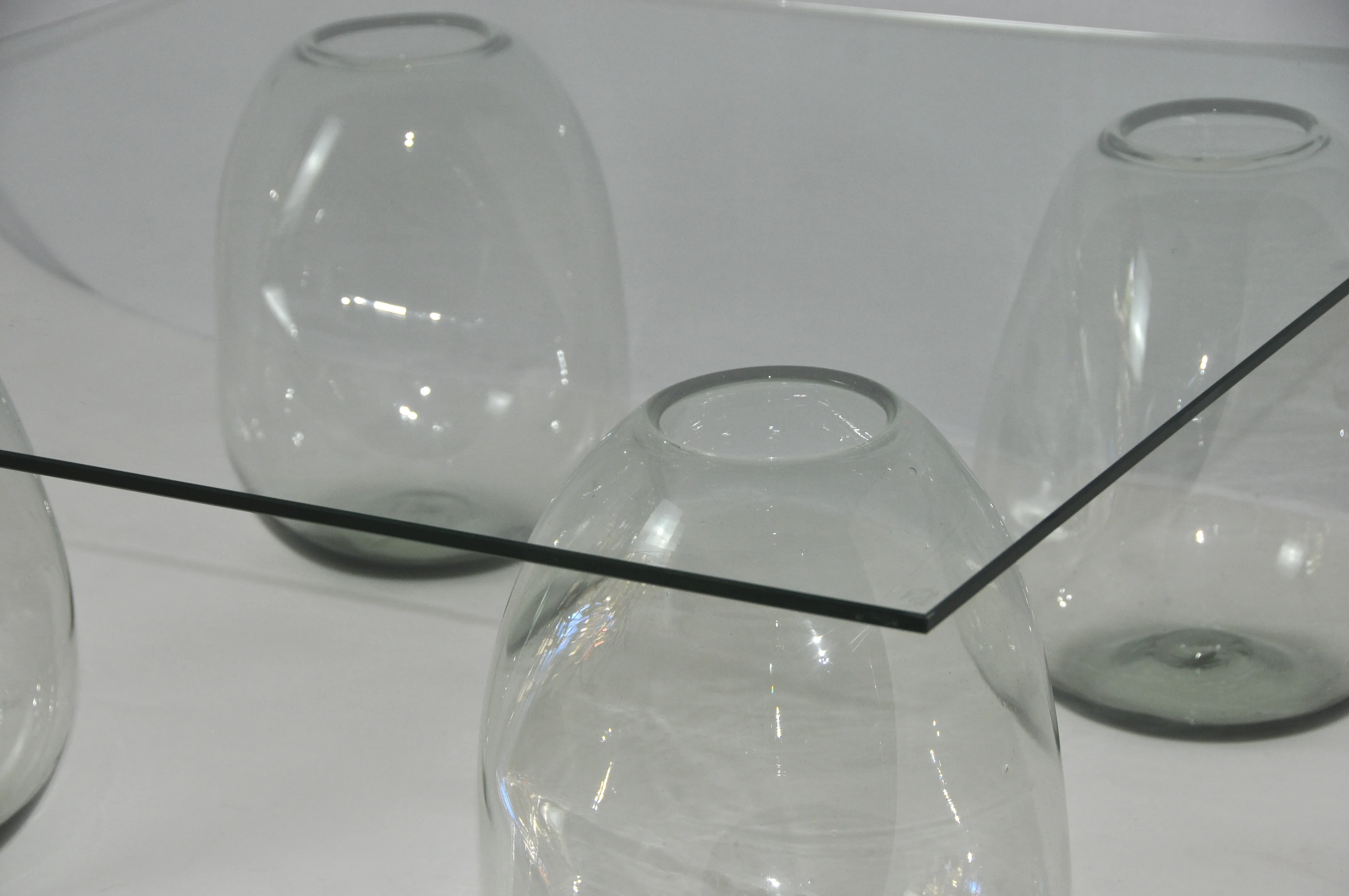The table consists of four hand-blown glass bubbles that support a square glass top, seamlessly held in place.