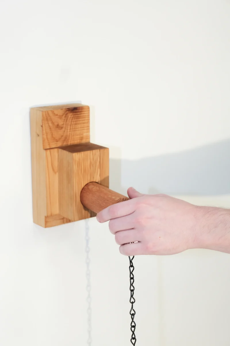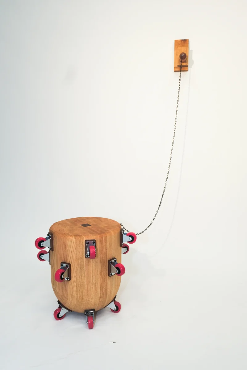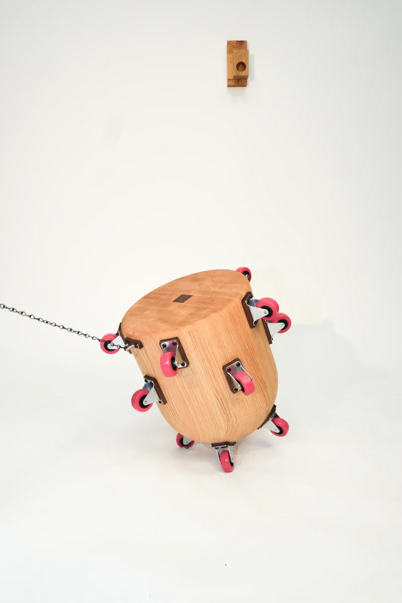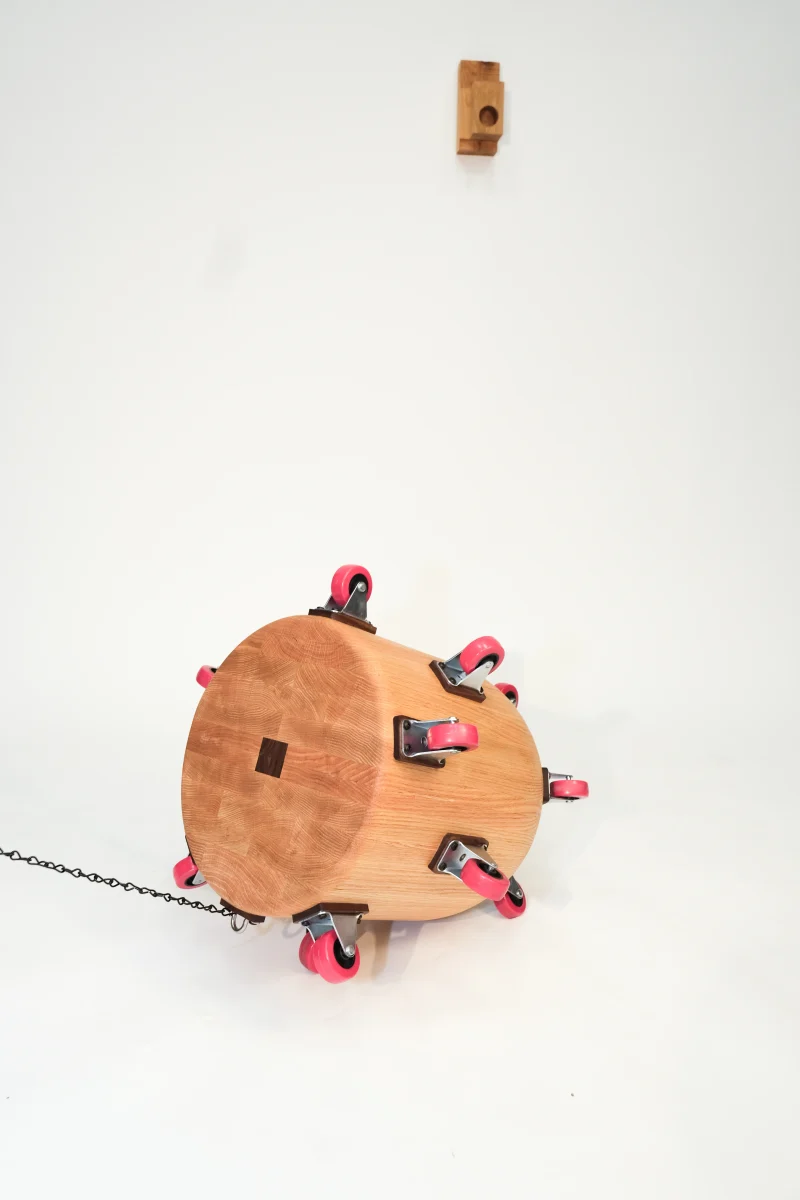 Budge is a conceptual seating object, designed as part of Nush’s MFA thesis collection. Drawing from the objects and spaces of street vendors in India, the object plays around with the ideas of mobility and staticity. The massive red oak volume, is made mobile by covering it’s sides with fixed casters. In the upright position, five wheels make contact with the ground and work against each other, effectively rendering the volume immovable. The Lacewood handle can be pulled and once tipped over, the stool can be pulled around and made mobile. The idea of being on five wheels and still being extremely stable is the idea on which the object is made.