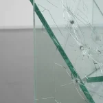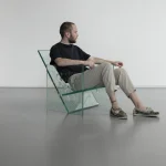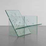 “c.1[bpg]” is a glass lounge chair that has been shot with no visible connections. The glass chair exemplifies a fascination with immateriality and structural integrity. Formed solely from planes of clear bulletproof glass, the chair’s solid state seems to dissolve. Almost invisible, these planes, without tangible support, hang in the air but with small details and a huge story behind it [war].