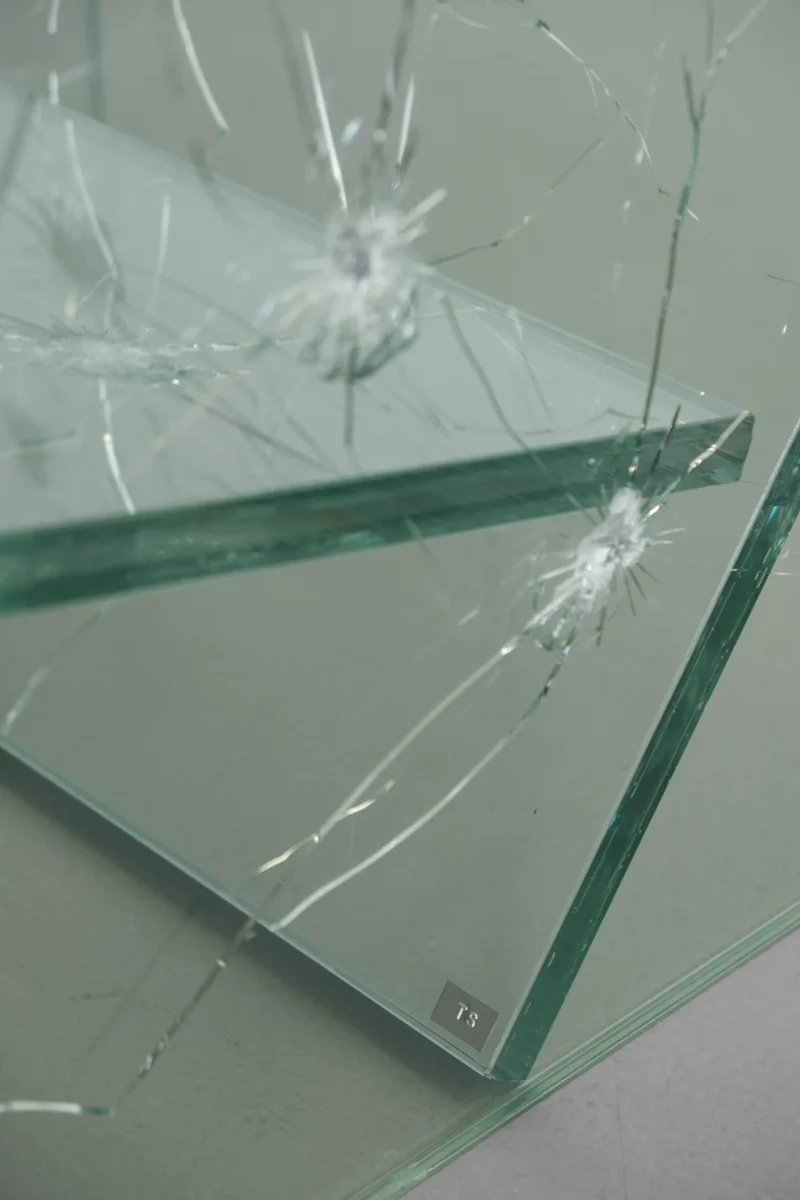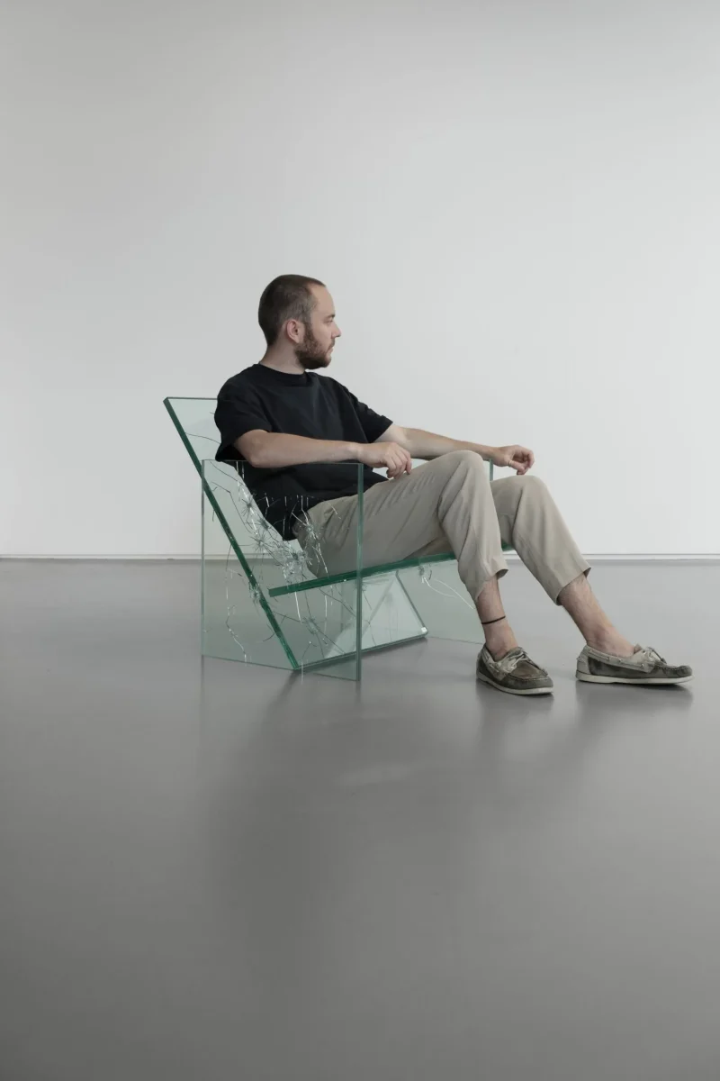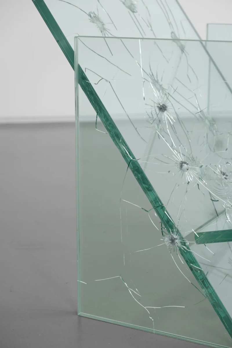 “c.1[bpg]” is a glass lounge chair that has been shot with no visible connections. The glass chair exemplifies a fascination with immateriality and structural integrity. Formed solely from planes of clear bulletproof glass, the chair’s solid state seems to dissolve. Almost invisible, these planes, without tangible support, hang in the air but with small details and a huge story behind it [war].