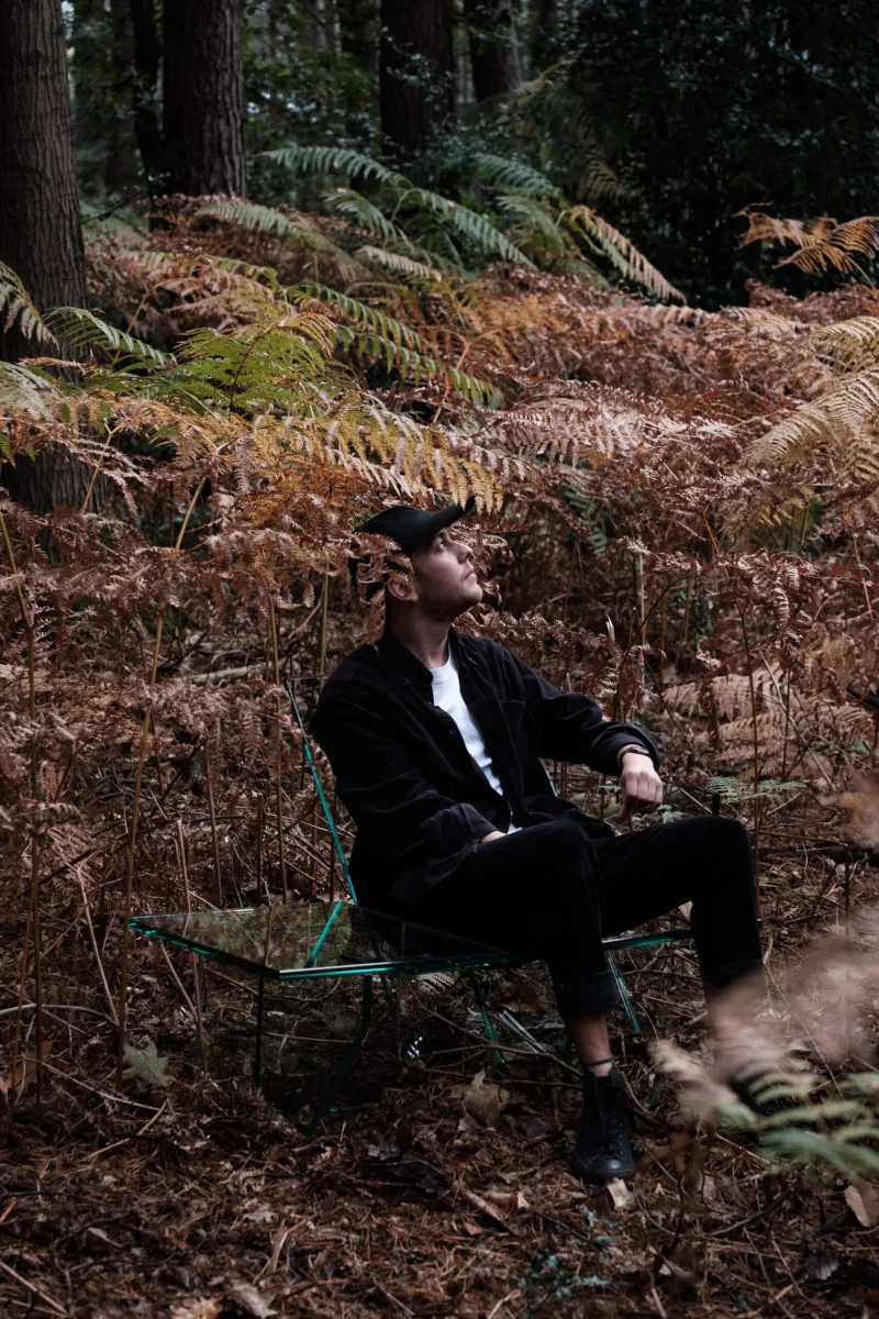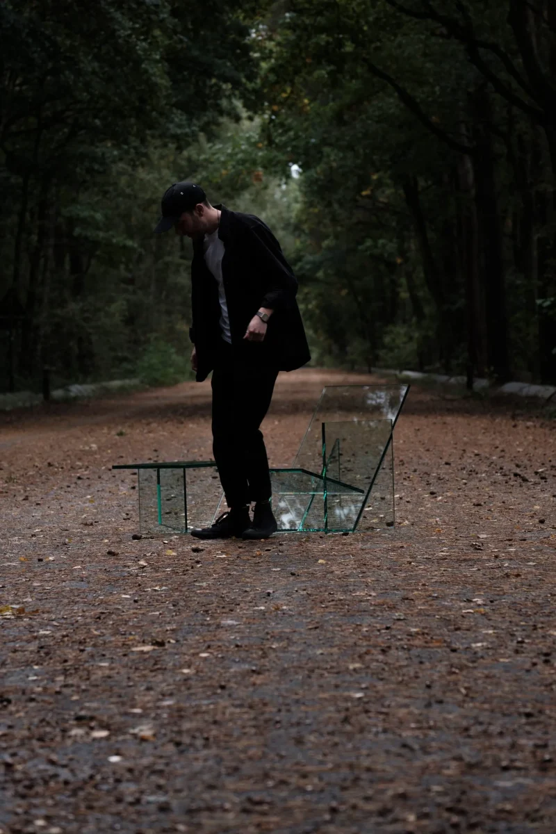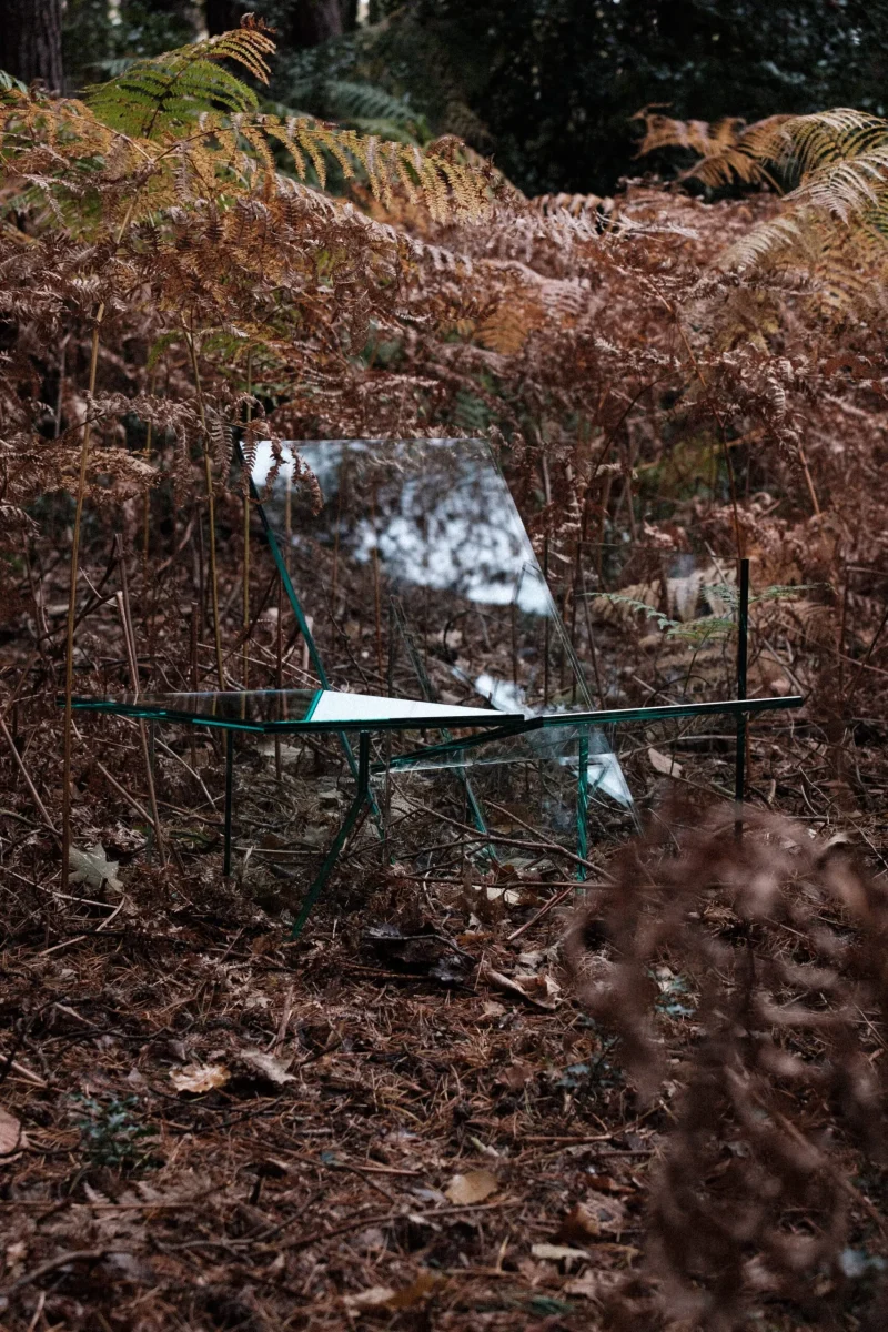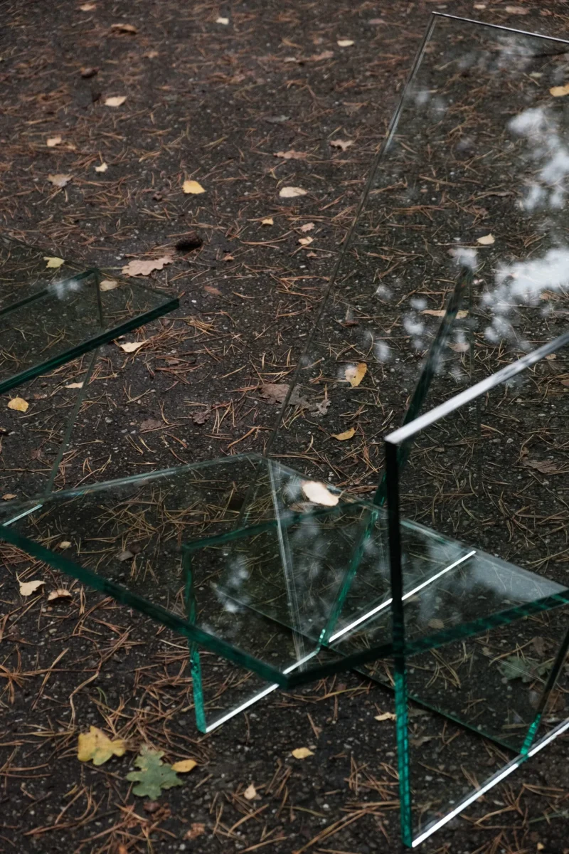 “c.1[g]” a glass lounge chair with no visible connections, which comes along a glass side table. The glass chair exemplifies a fascination with immateriality and transparency. Formed solely from planes of clear glass, the chair’s solid state seems to dissolve. Almost invisible, these planes, without tangible support, hang in the air.