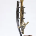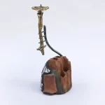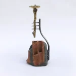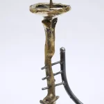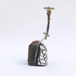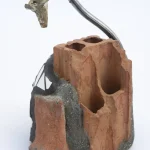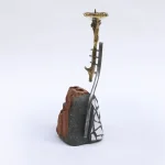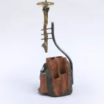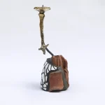 THe Ca_01 candelabra by Leo Maher Crafted from the remnants of a terracotta construction brick, reminiscent of those found scattered along Mediterranean shores. The brick has been ground to imitate the chattering of similar materials, churned by the sea into pebbles. Partially encased in concrete, another naturally ground terracotta pebble is embedded alongside it. An internal metal armature ensures the piece’s strength and durability. A visible steel armature extends from the side, supporting a bronze spike crafted through lost-wax casting.