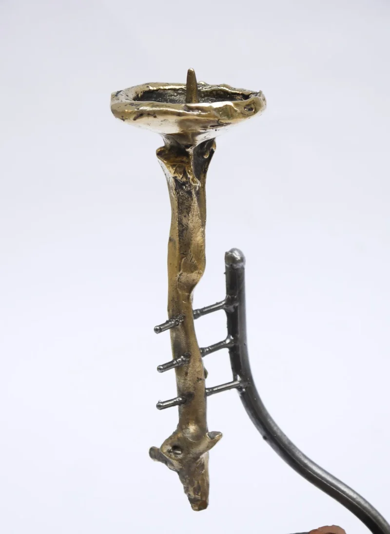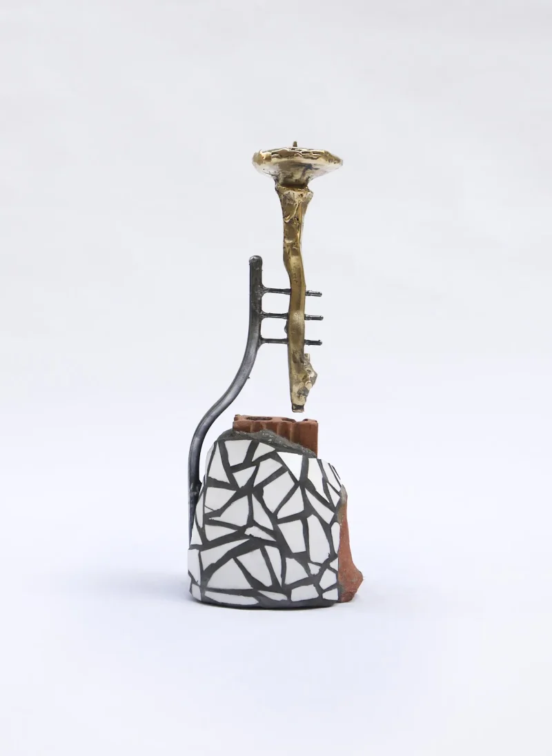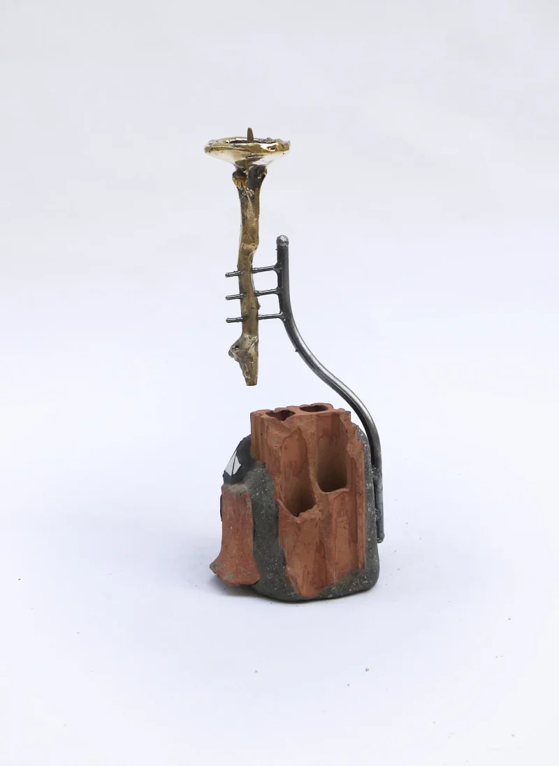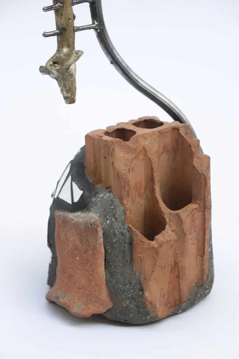 THe Ca_01 candelabra by Leo Maher Crafted from the remnants of a terracotta construction brick, reminiscent of those found scattered along Mediterranean shores. The brick has been ground to imitate the chattering of similar materials, churned by the sea into pebbles. Partially encased in concrete, another naturally ground terracotta pebble is embedded alongside it. An internal metal armature ensures the piece’s strength and durability. A visible steel armature extends from the side, supporting a bronze spike crafted through lost-wax casting.