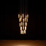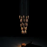 Hovering between system and gravity, Cadere becomes a gentle choreography of light, color, and form. The hanging elements, each casting a warm, focused glow, recall the intimacy of candlelight. Together they gather into a luminous constellation, expanding upward toward the ceiling – as if the light itself were ascending.