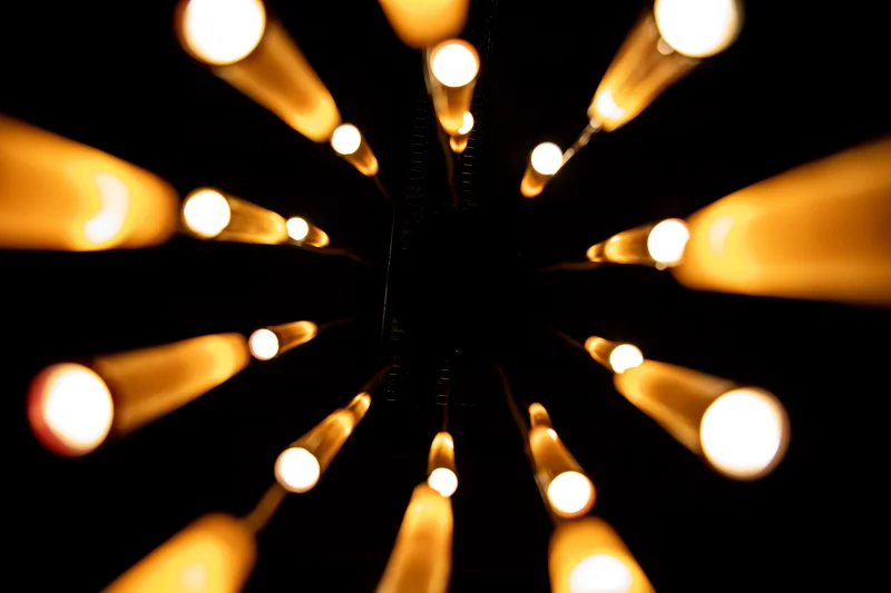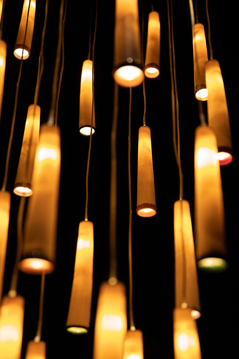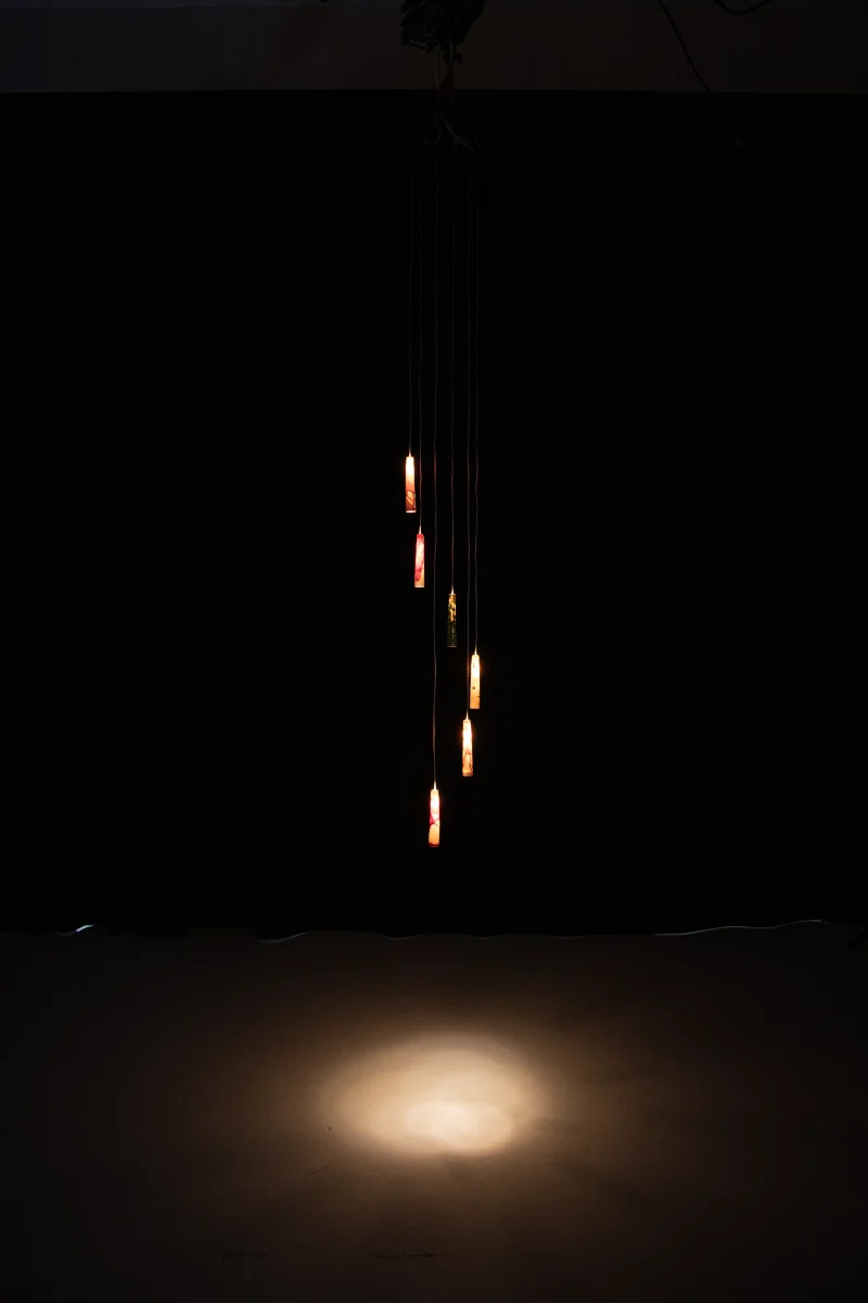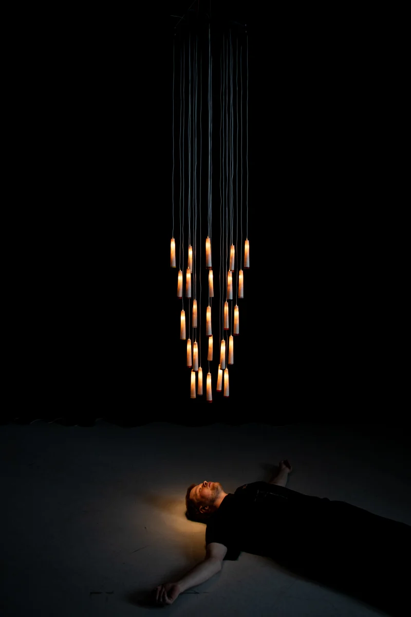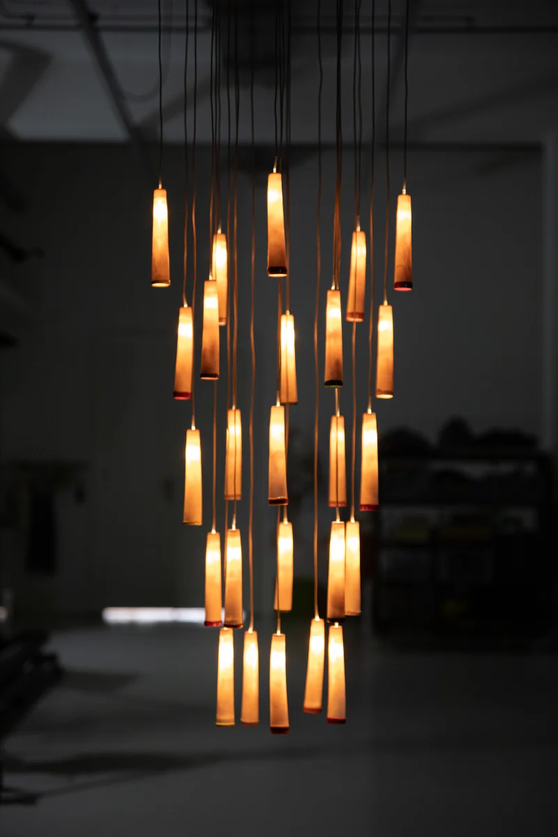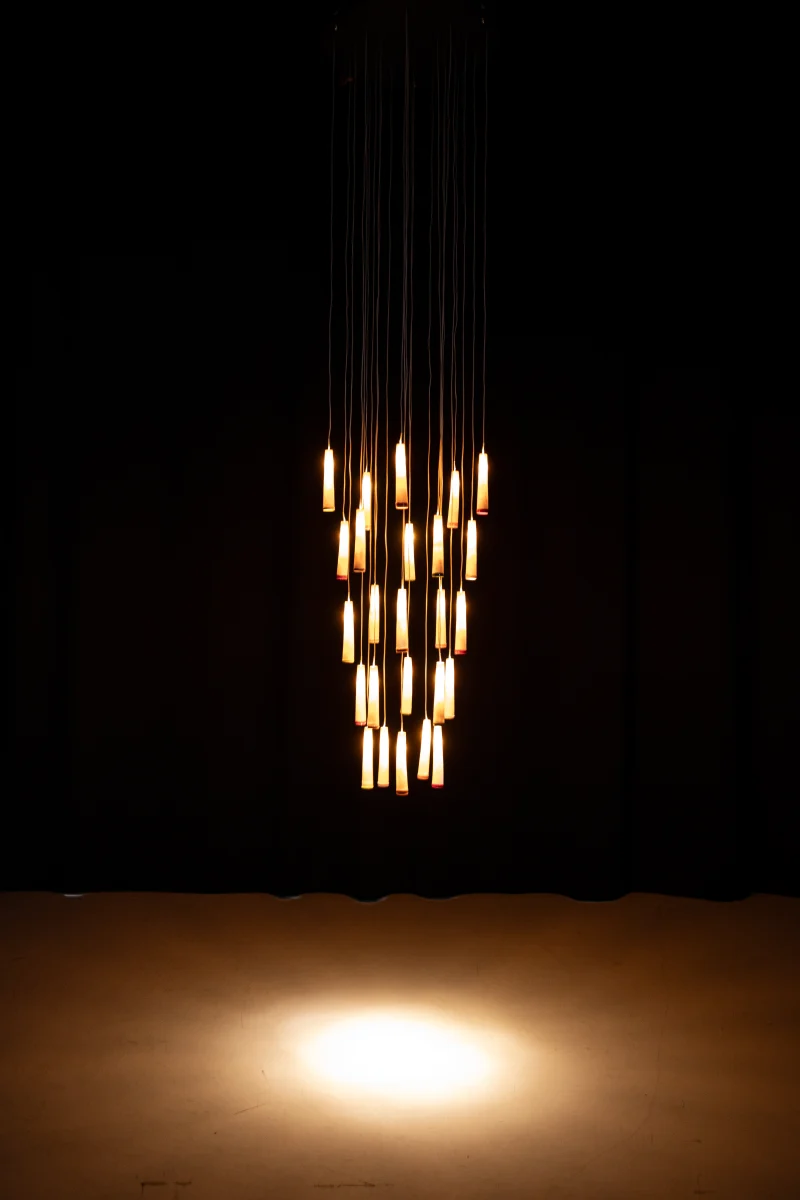 Hovering between system and gravity, Cadere becomes a gentle choreography of light, color, and form. The hanging elements, each casting a warm, focused glow, recall the intimacy of candlelight. Together they gather into a luminous constellation, expanding upward toward the ceiling – as if the light itself were ascending.