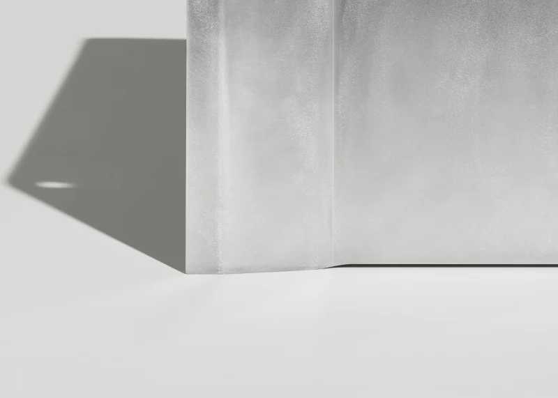 Starting with a flat rectangle, two angular cuts are made. The first three folds are then made lengthwise by machine, after which the legs are finally bend into the right angle by hand, resulting in a sleek, brutalist coffee table.