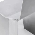 Starting with a flat rectangle, two angular cuts are made. The first three folds are then made lengthwise by machine, after which the legs are finally bent into the right angle by hand.