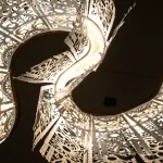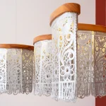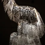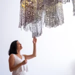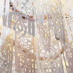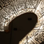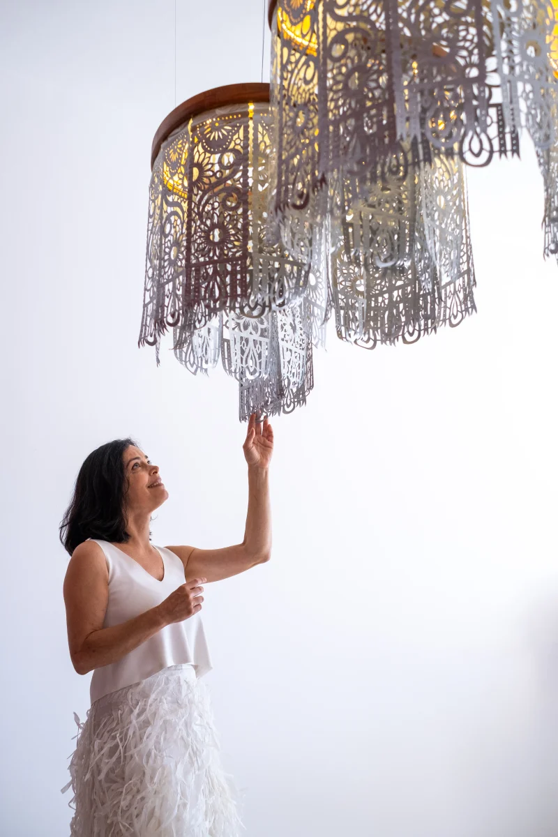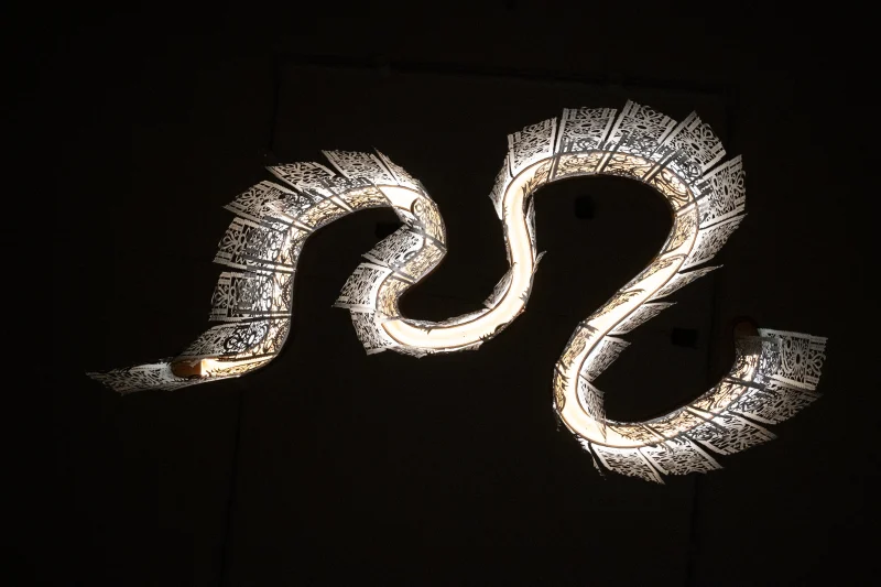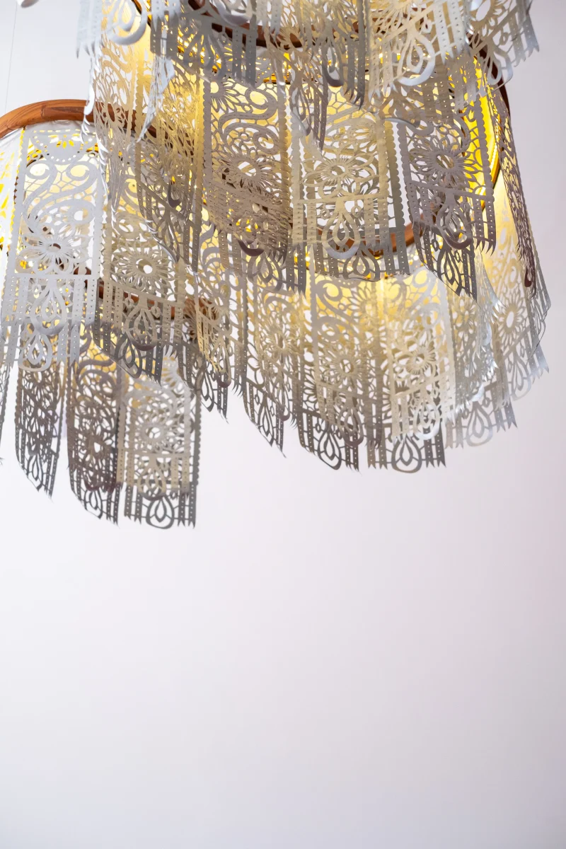 Caminho da Alma is a pendant sculptural luminaire where the delicacy of the designs made on shredded paper creates passages of light that appropriate the subtlety of the wind. The silver tone of the paper references the true wealth of the Mexican people, which, besides colonization, remains in their country safeguarded in the traditions kept alive by their artisans. The sinuous movement of the piece is guided by the feathered serpent that travels through the poetic labyrinth of life, glimpsing the future of humanity in respect for ancestry. It juxtaposes artisanal tradition and contemporary design as a means of conveying unity and connection. Its design explores the interaction between an everyday lamp, a sculpture, and the ethereal attributes of light. It was born from the encounter between Brazilian designer Maria Fernanda Paes de Barros and the Mexican artisan Sérgio Hernandéz, who masters the art of shredded paper, a tradition still present in the daily life of Mexican people, decorating streets, livening up parties, telling stories.