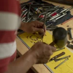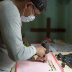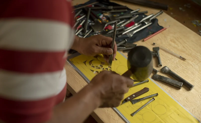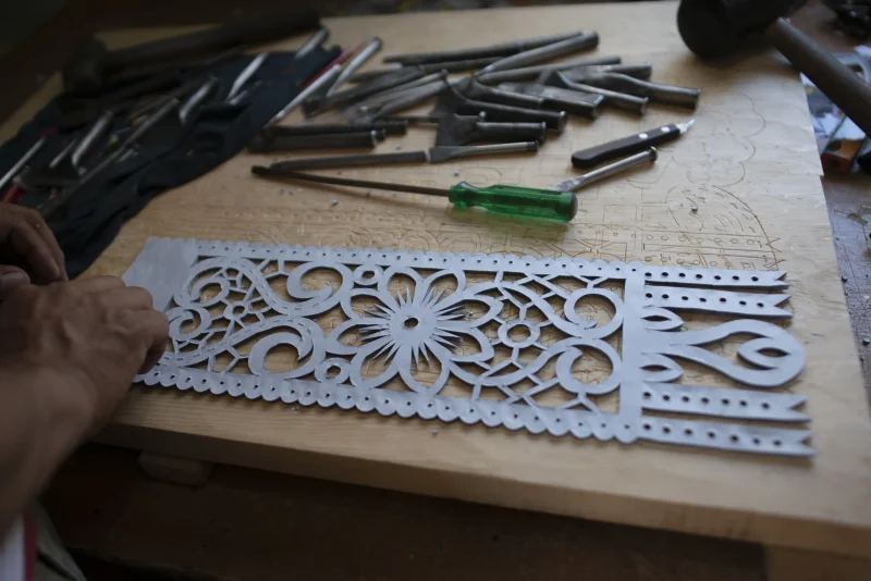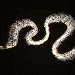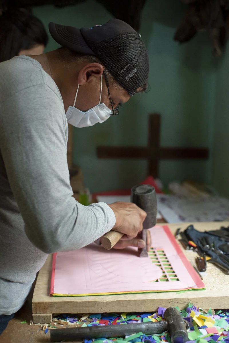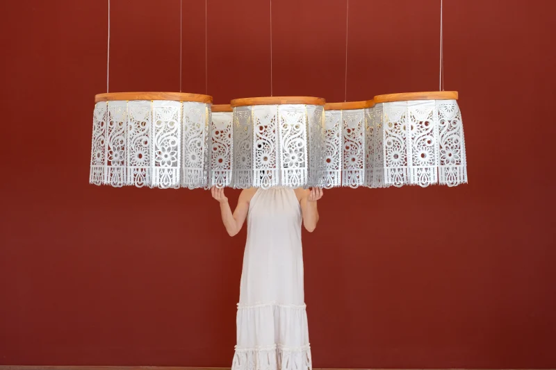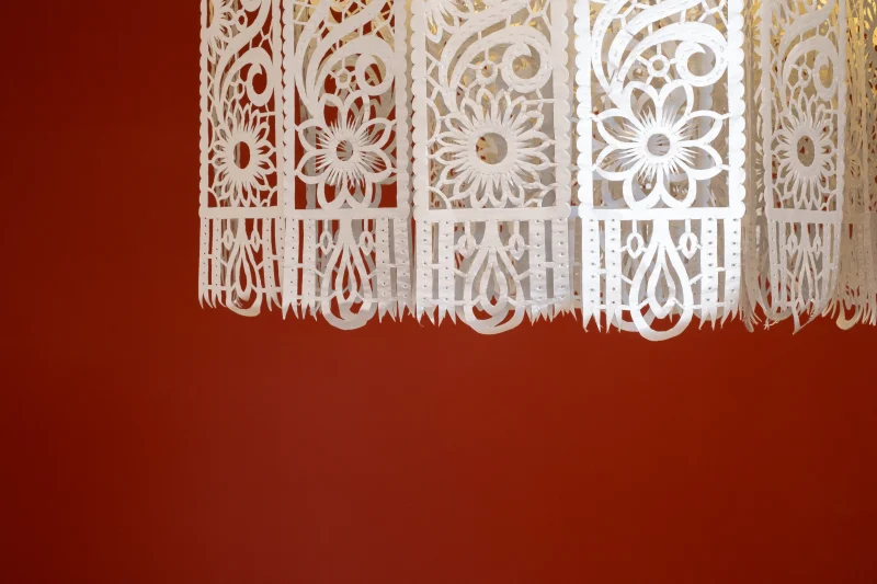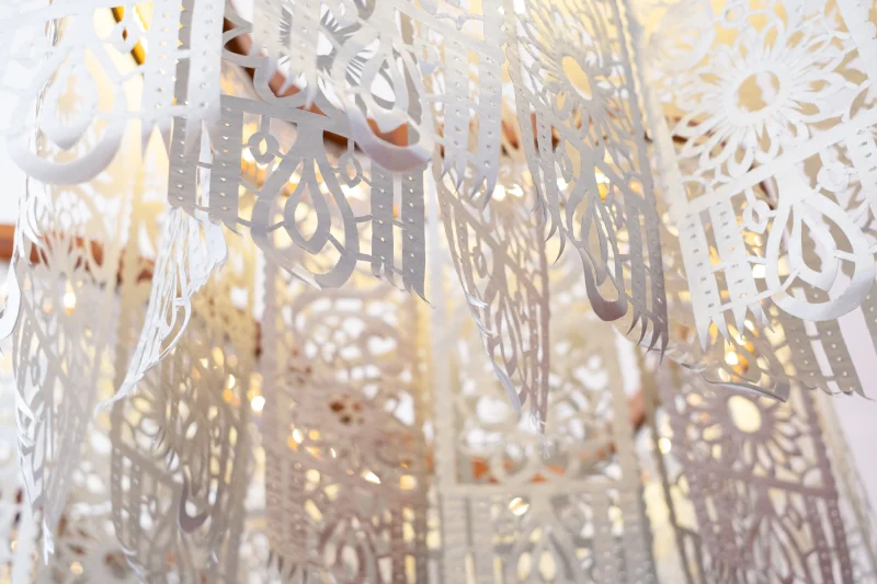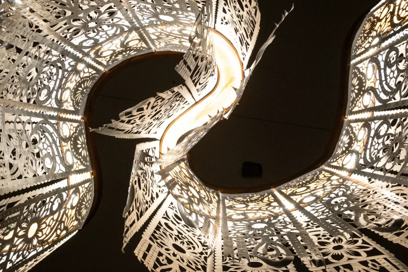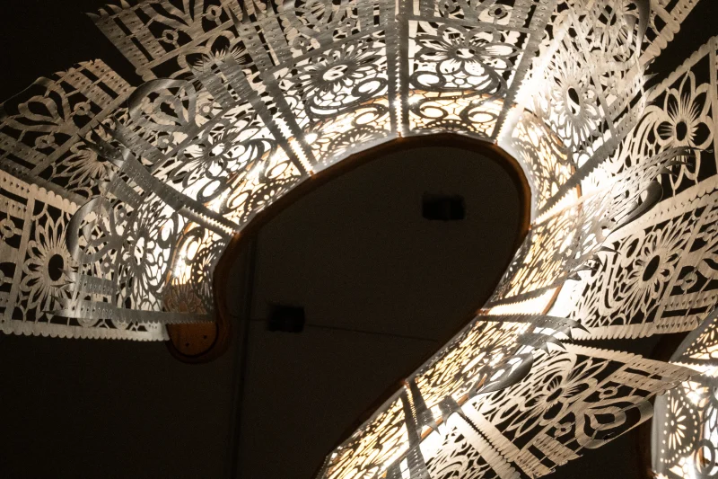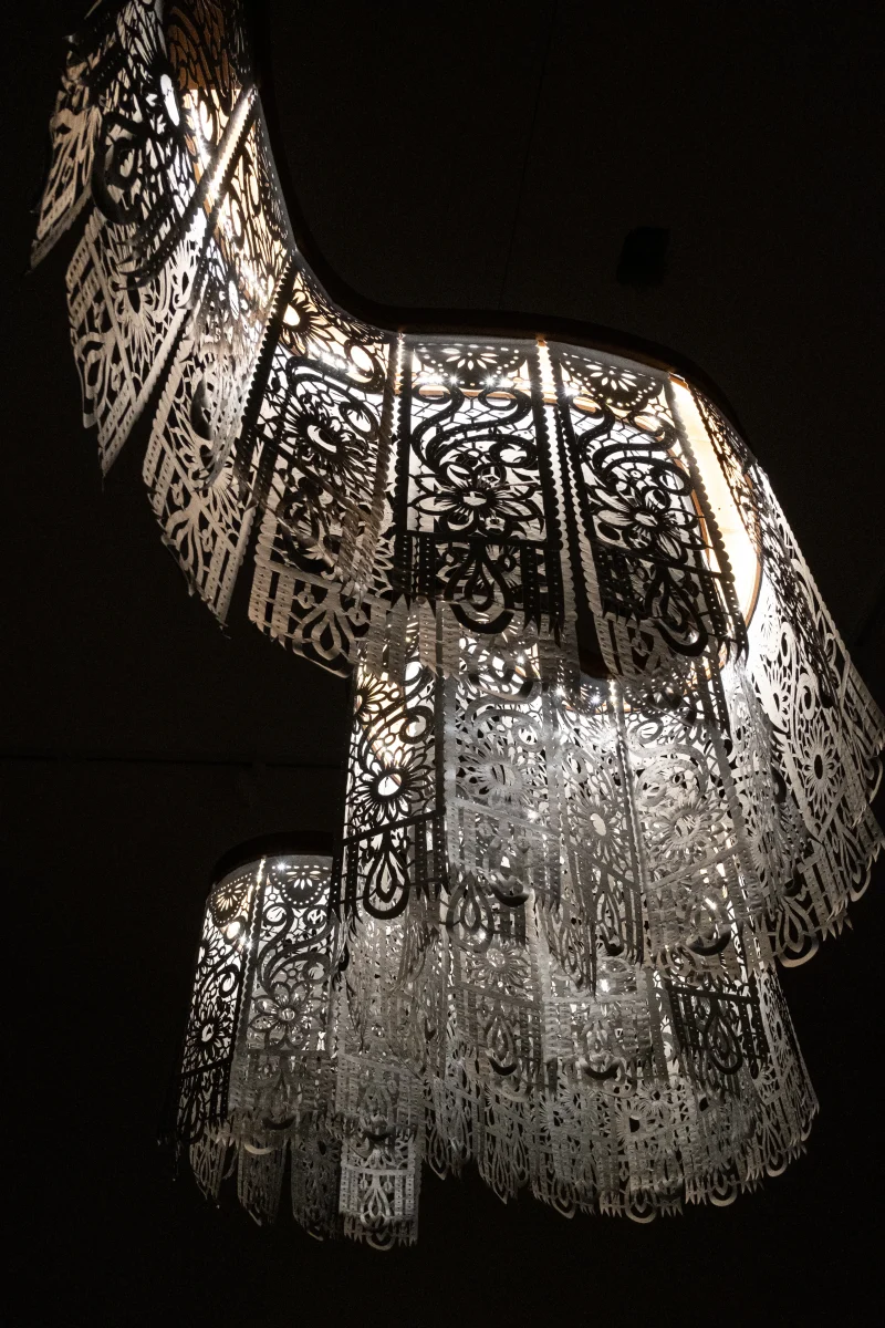 Invited to participate in the residency and exhibition Visión y Tradición in Mexico, Maria Fernanda sought to create a work that values and at the same time keeps intact the tradition of “Papel Picado” in the country. To keep the tradition as intact as possible and value it exactly as it is, an elegant structure has been created and discreet, suspended by steel cables. Its sinuous shape carved in wood simulates the movement of Quetzalcoatl, the Feathered Serpent, a deity that, according to Aztec belief, contributed to the creation of Humanity. God of wind, air, and dawn. God of knowledge and learning, arts and crafts, Quetzalcoatl represents the duality inherent to the human condition: the ‘serpent,’ the physical body with its limitations, and the ‘feathers,’ the spiritual principles.