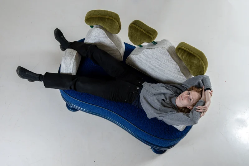 Upholstered in Pierre Frey teddy mohair, Metaphores flat-weave, and Nobilis bouclé with dyed leather piping