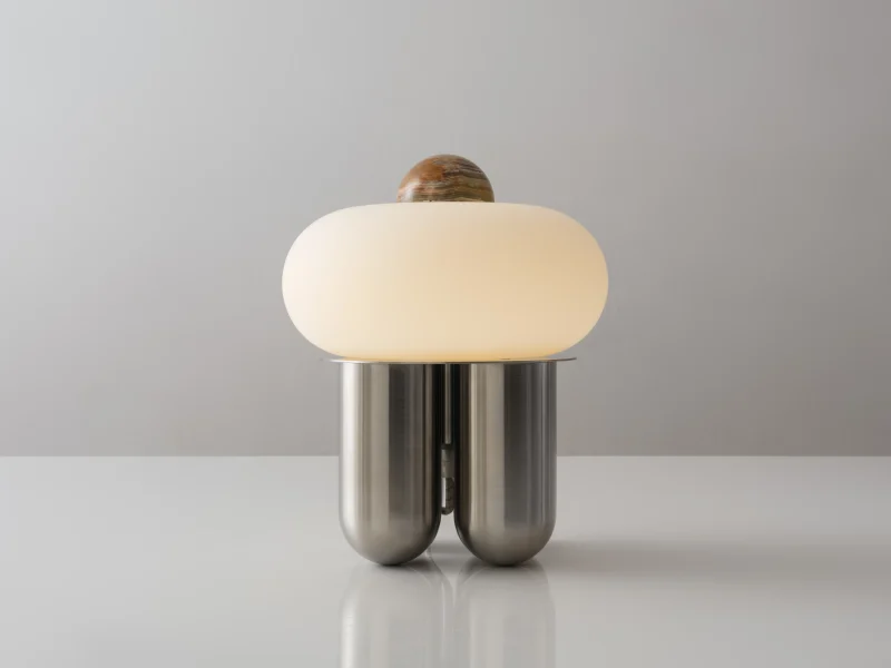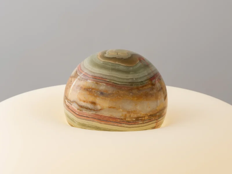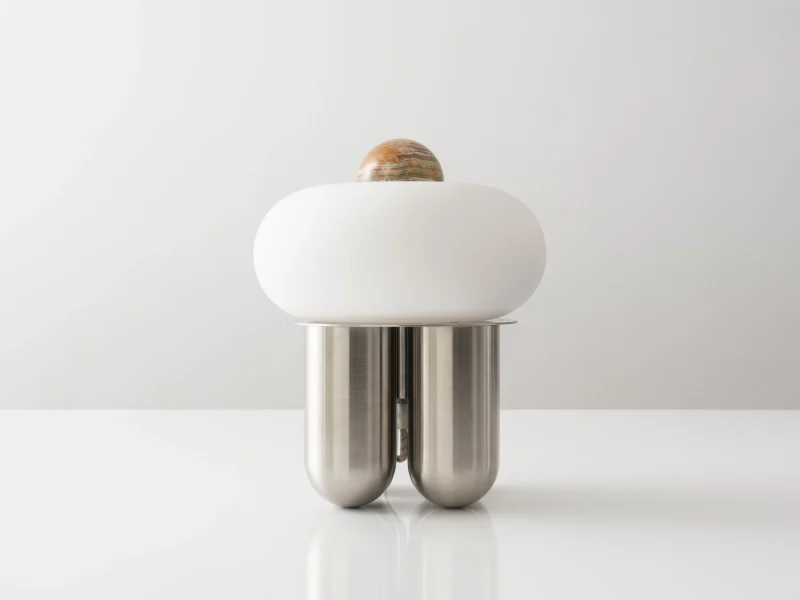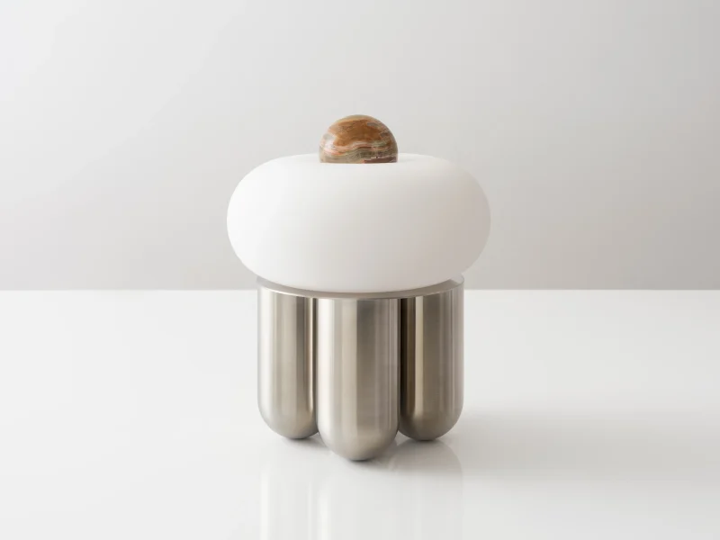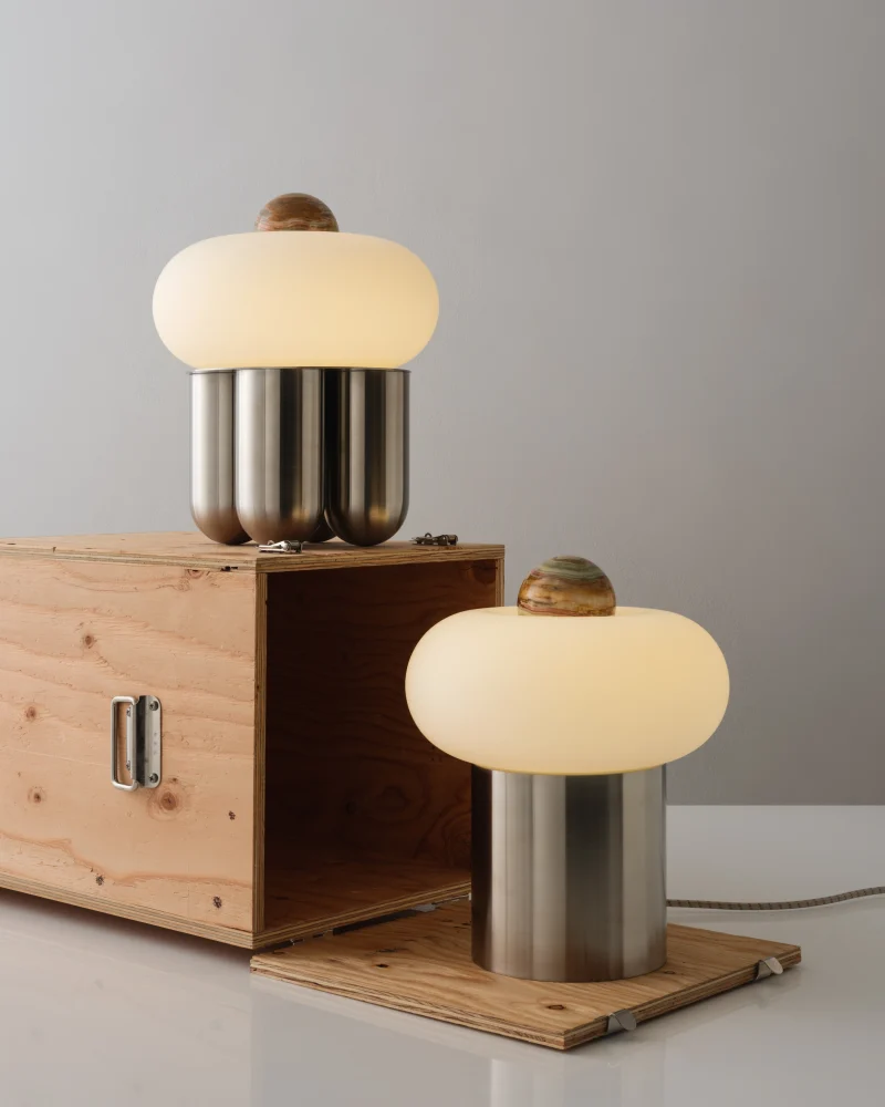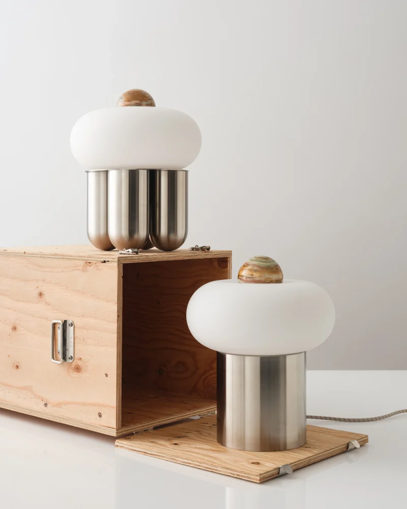 Capsula is a sculptural table lamp handcrafted in New York City by Noiro Studio. Merging material integrity with poetic form, it features a brushed stainless steel base, a mouth-blown glass shade, and a precision-cut onyx top. Drawing inspiration from the fluidity of space and the organic forms found in nature, Capsula offers a contemplative interplay between structure and light.