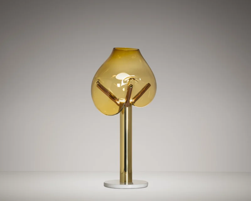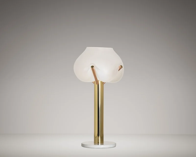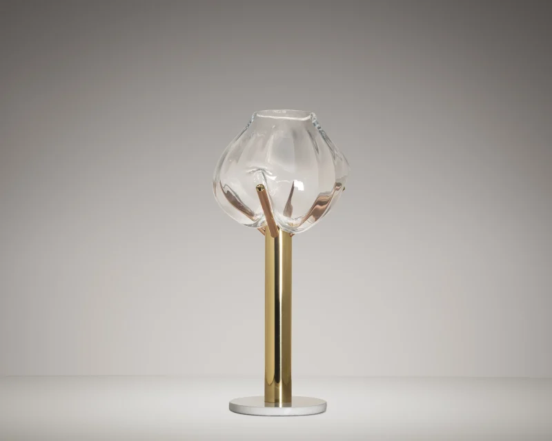 Dialogues and provocations with the glass masters and the presence of the artist in the process characterize each piece. The lightness of glass opposed to the weight of the copper materials, brass and marble all worked by hand. Noble, durable and sustainable materials provide long life to the piece. It is a synthesis of the materials already used in other collections.