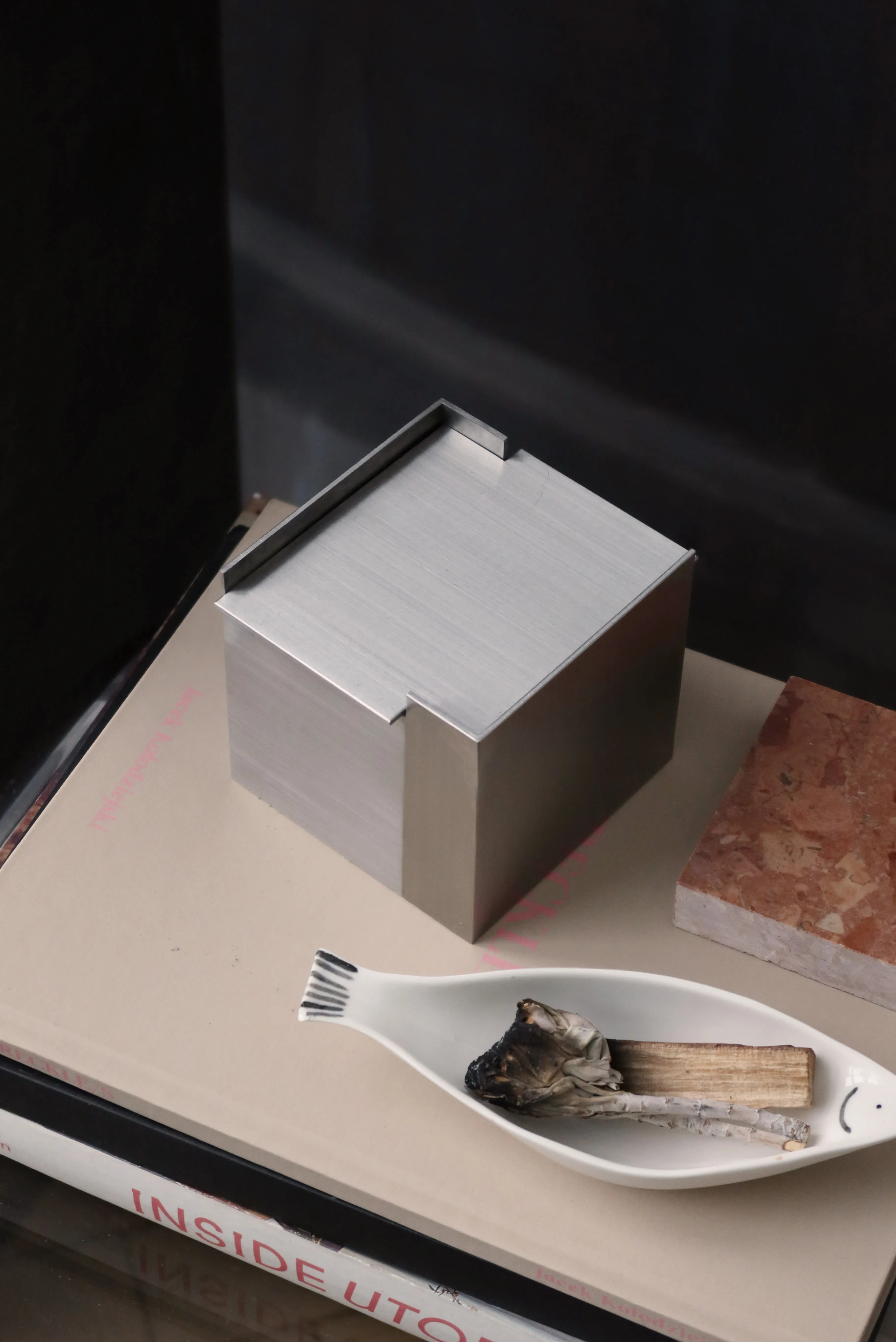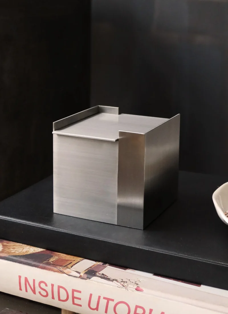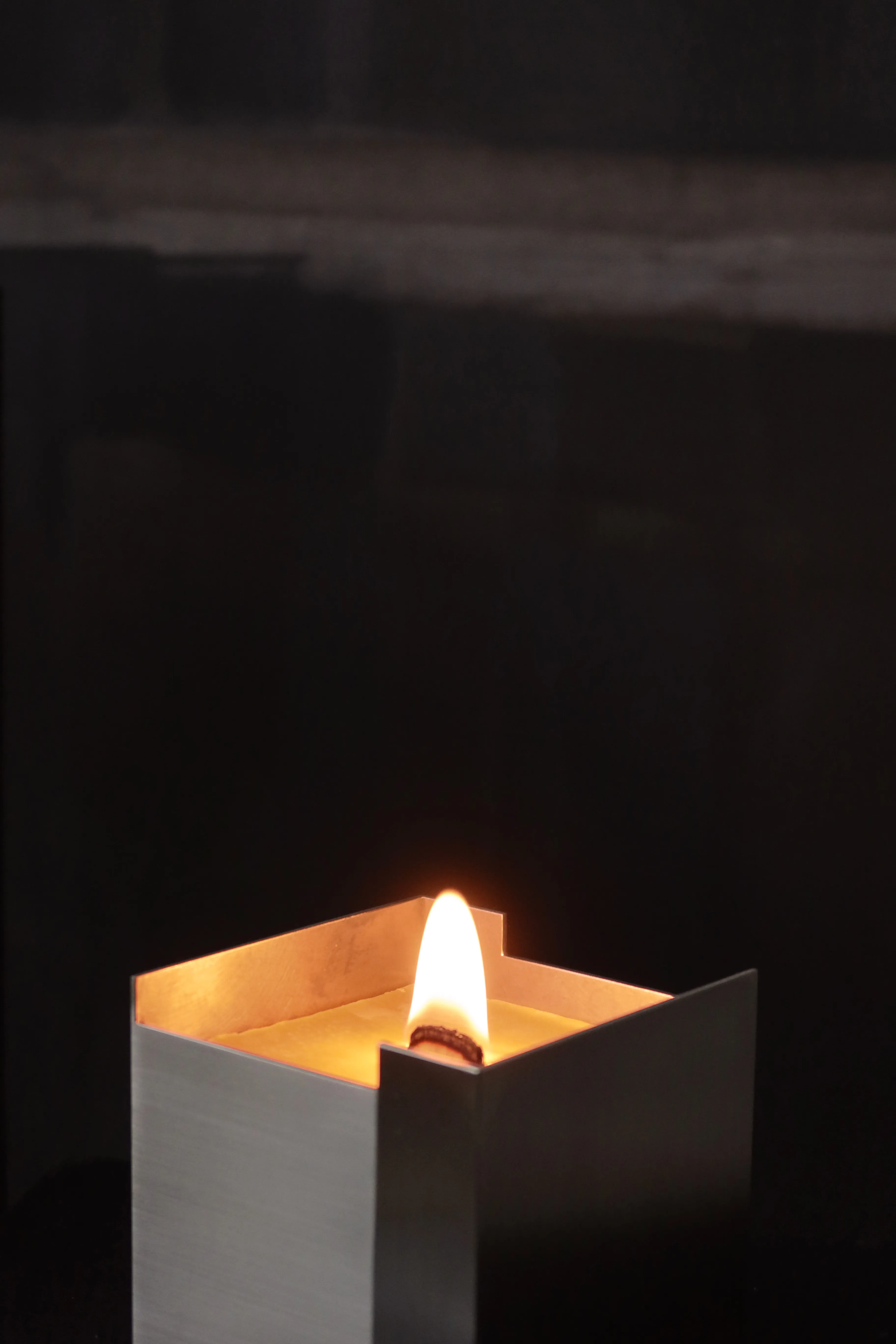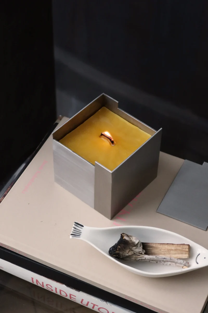 The form is complemented by a fitted lid which, once the candle has burned down, can be reused as a refined storage box for small objects. It is a design that thinks long-term—both aesthetically and functionally.