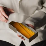 The product is made of multi-directional brushed stainless steel. It is designed for storing office items and more. The interior is lined with black and mango yellow leather.