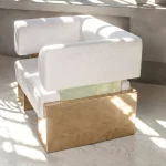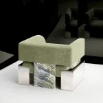The Case Armchair – Small offers an effective combination of comfort and bold design, featuring a soft seat and back with a polished metal frame and natural stone accents. Its square shape and spacious dimensions highlight the chair’s premium, brutish aesthetics, creating a striking contrast between softness and strength. This armchair is perfect for those looking for a statement piece that blends luxury with industrial design.