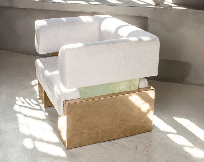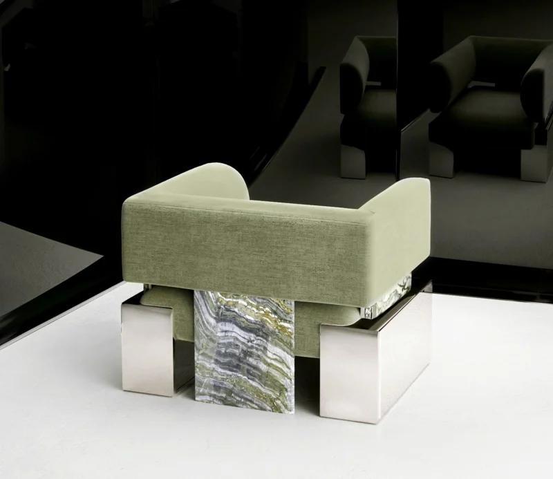 The Case Armchair – Small offers an effective combination of comfort and bold design, featuring a soft seat and back with a polished metal frame and natural stone accents. Its square shape and spacious dimensions highlight the chair’s premium, brutish aesthetics, creating a striking contrast between softness and strength. This armchair is perfect for those looking for a statement piece that blends luxury with industrial design.