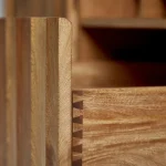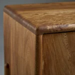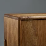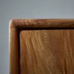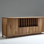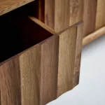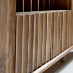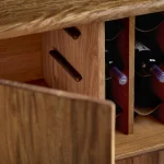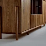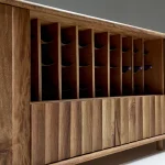 Our Salomón wine cabinet is crafted from solid Rosa Morada wood, creating a furniture piece with a distinct character that will spark conversations and hold your favorite wines. It features doors and fronts with machined concave channels in 1-inch solid wood. The sides and top are made of 1 1/2-inch solid wood, while the interior cabinet is veneered MDF. The wine section includes vertical dividers in veneered MDF, and there are leather strips to securely hold the bottles. Additionally, it includes a 90cm drawer with a bottom-mount slide and a slow-closing mechanism.