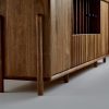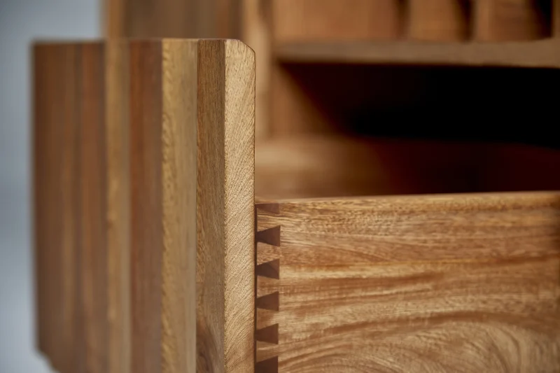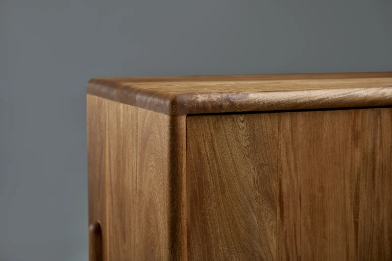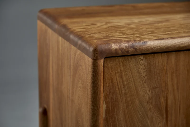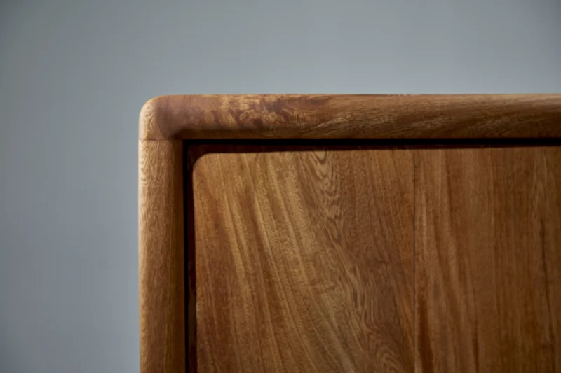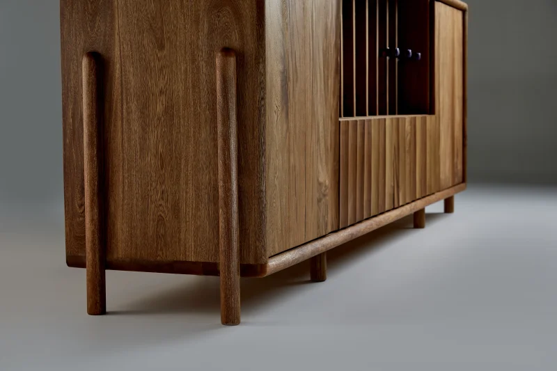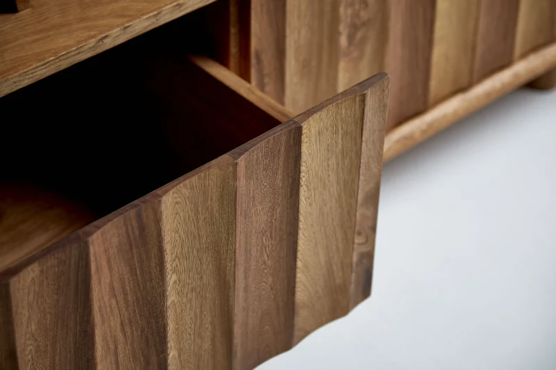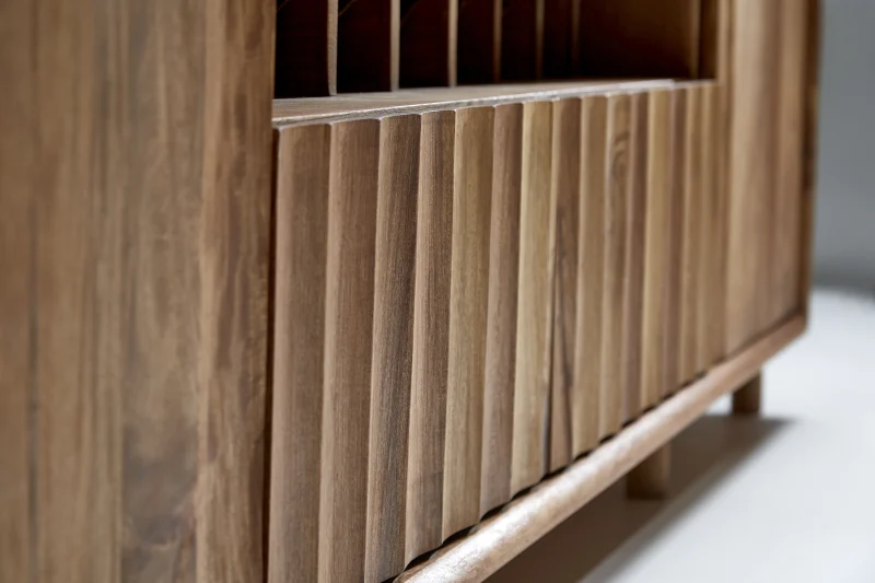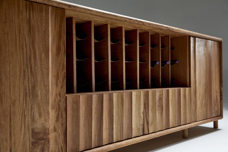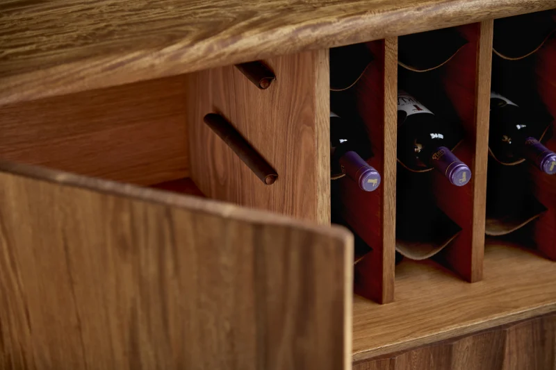 Our Salomón wine cabinet is crafted from solid Rosa Morada wood, creating a furniture piece with a distinct character that will spark conversations and hold your favorite wines. It features doors and fronts with machined concave channels in 1-inch solid wood. The sides and top are made of 1 1/2-inch solid wood, while the interior cabinet is veneered MDF. The wine section includes vertical dividers in veneered MDF, and there are leather strips to securely hold the bottles. Additionally, it includes a 90cm drawer with a bottom-mount slide and a slow-closing mechanism.