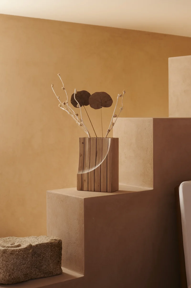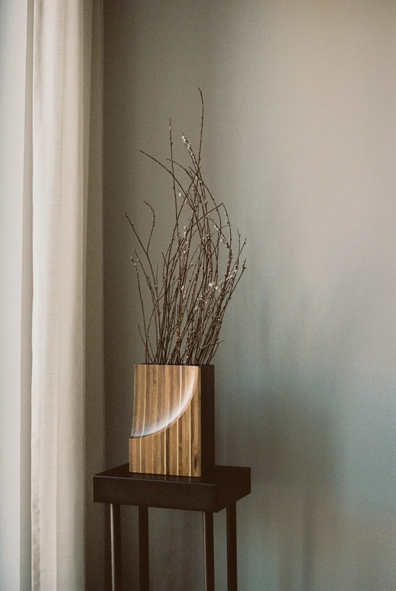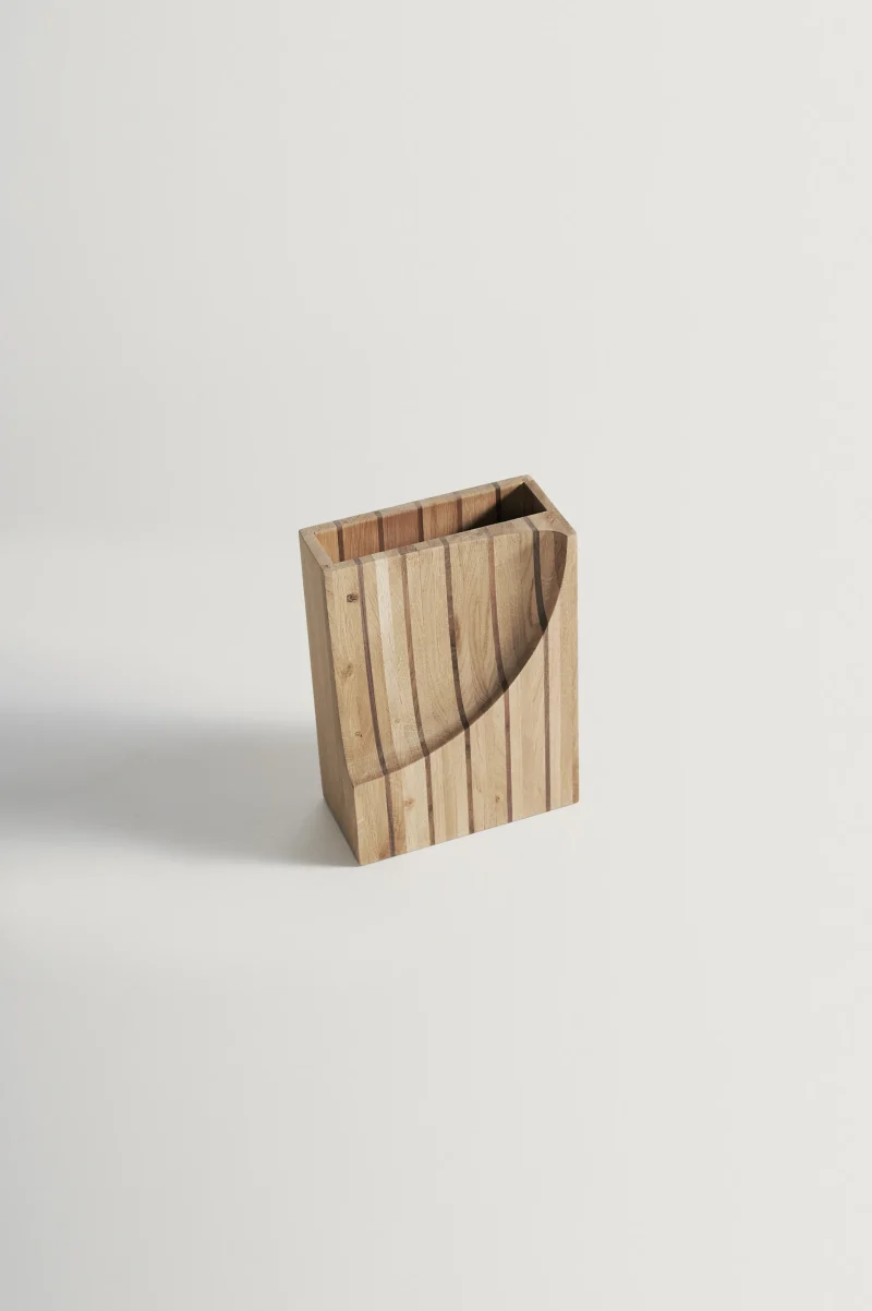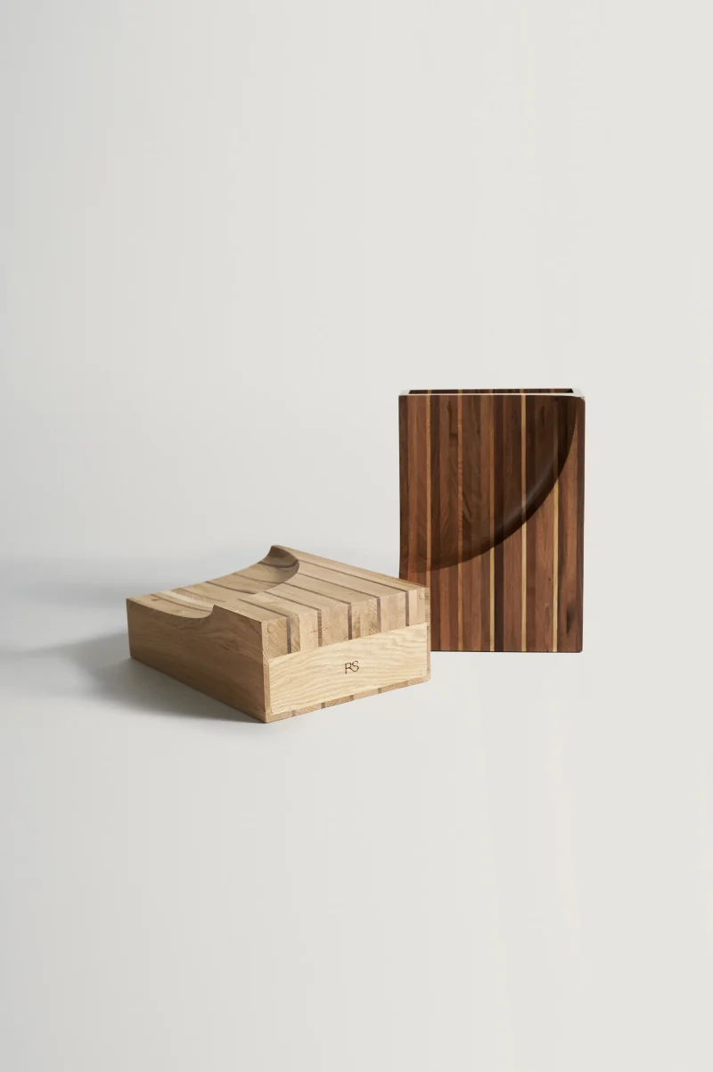 A design masterpiece, crafted from repurposed solid walnut and oak wood into a simple, chunky geometric form. Vaga Chair features precise patchwork craftsmanship, elevating the uniqueness of natural timber. The design blends traditional woodworking techniques with modern manufacturing processes, resulting in a thoughtfully designed, one-of-a-kind piece of furniture that celebrates Portugal’s rich heritage of woodworking. Whether making a statement as a standalone centerpiece or enhancing your living space, the chair blends aesthetics and craftsmanship, transcending functionality to inspire contemplation on the art of creation.